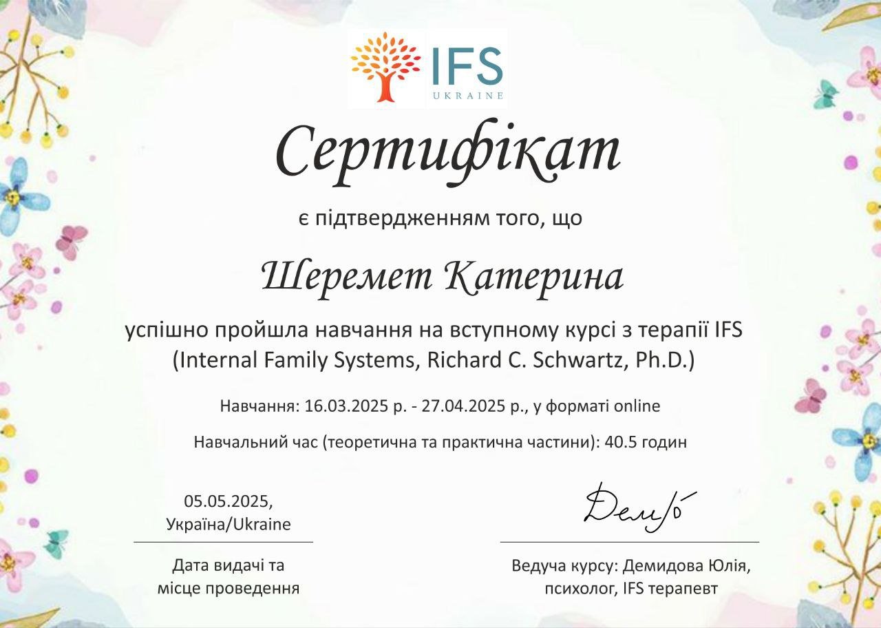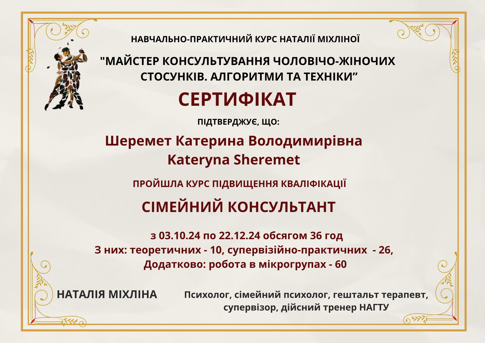 2021 – 2022, Школа психологической практики Анны Дердюк, Киев; квалификация: психолог-консультант.