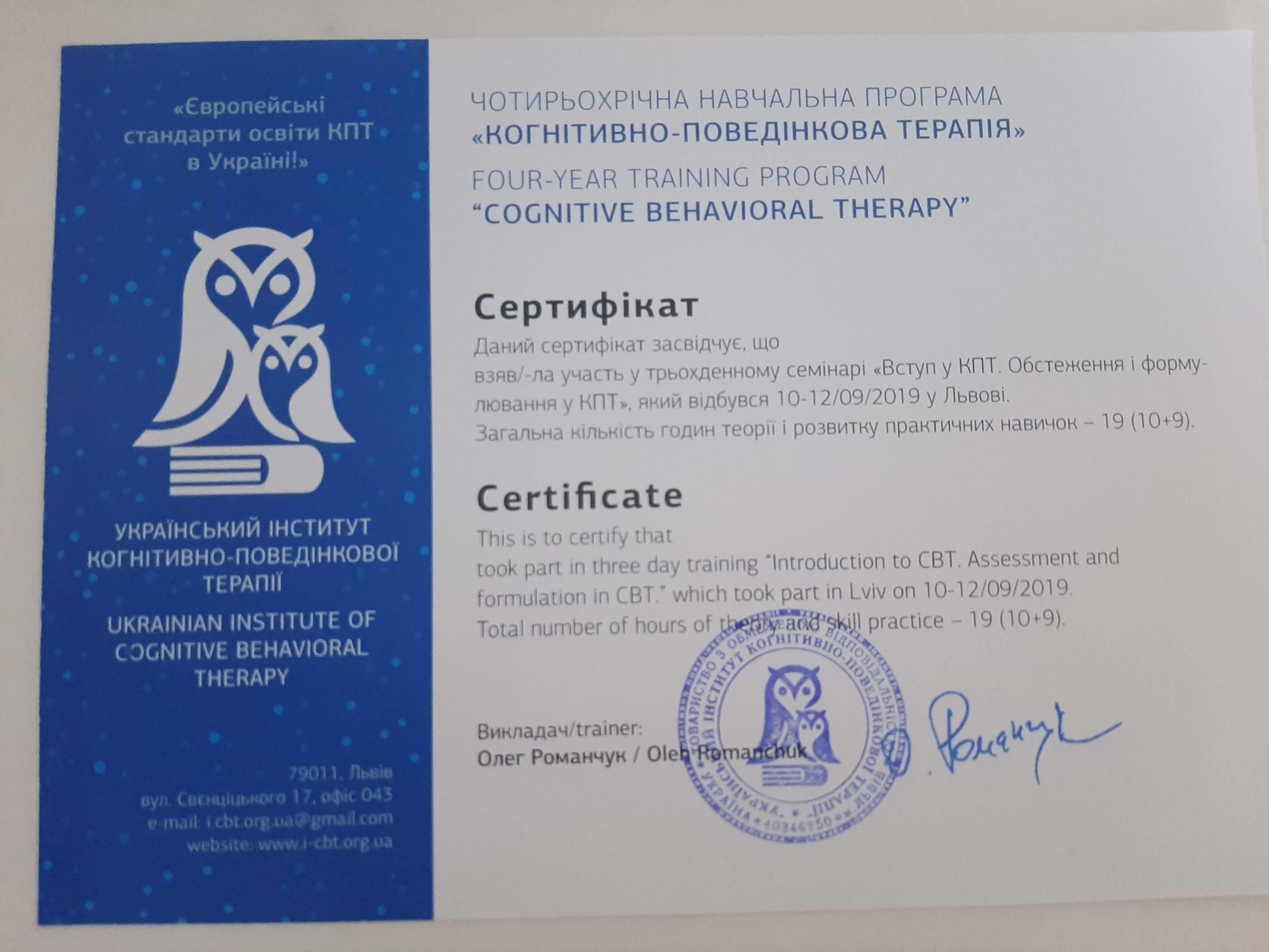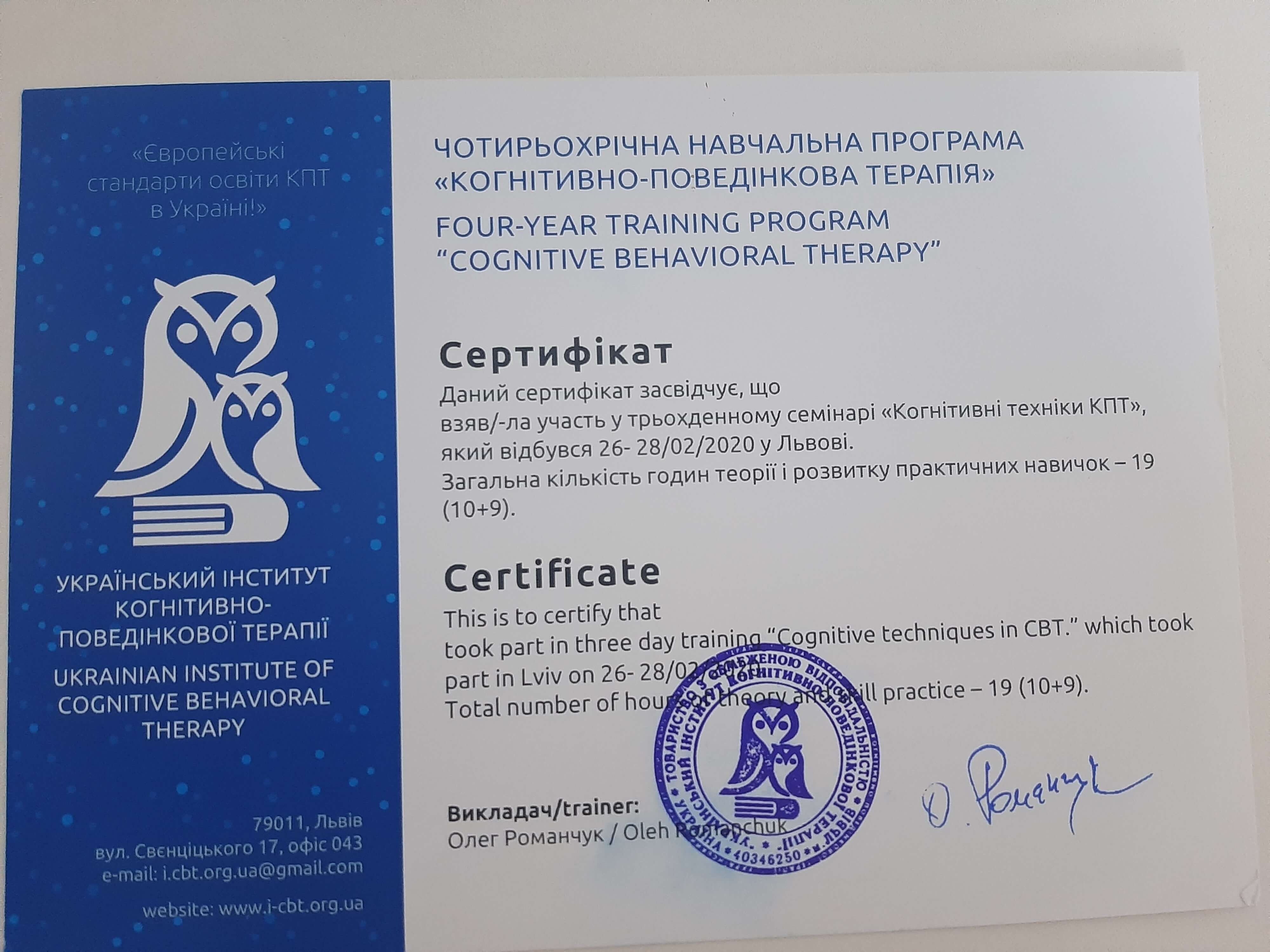Прохожу обучение в Украинском институте когнитивно-поведенческой терапии.