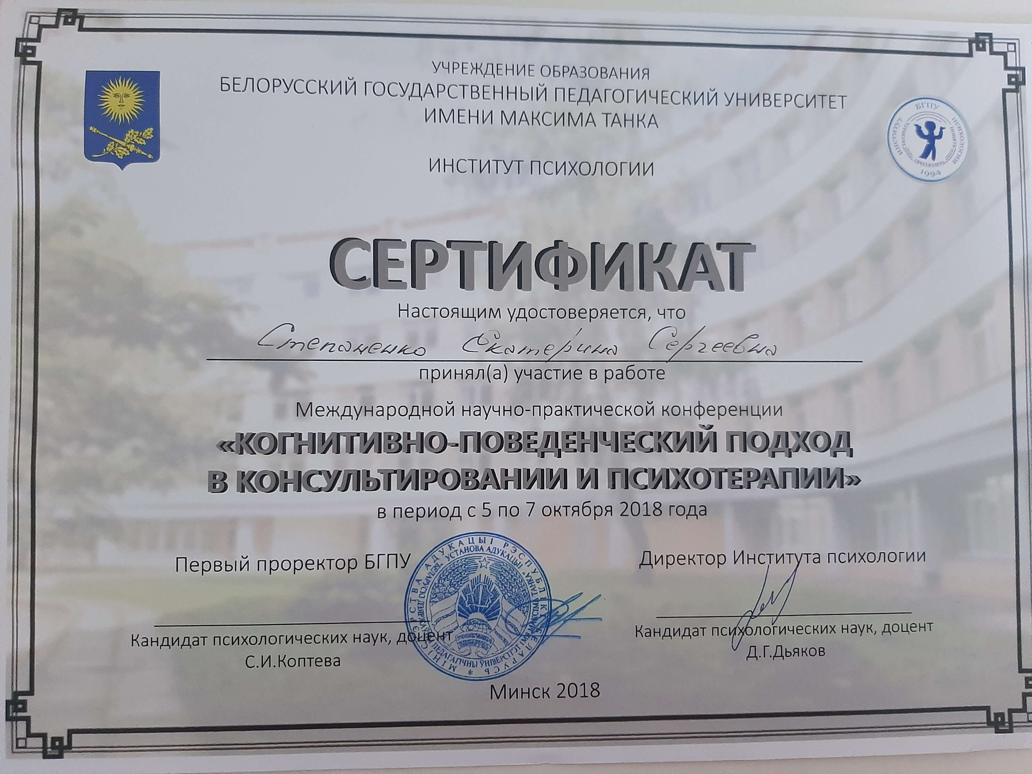 Приняла участие в цикле ознакомительных семинаров "Основы когнитивно-поведенческого подхода в психотерапии".