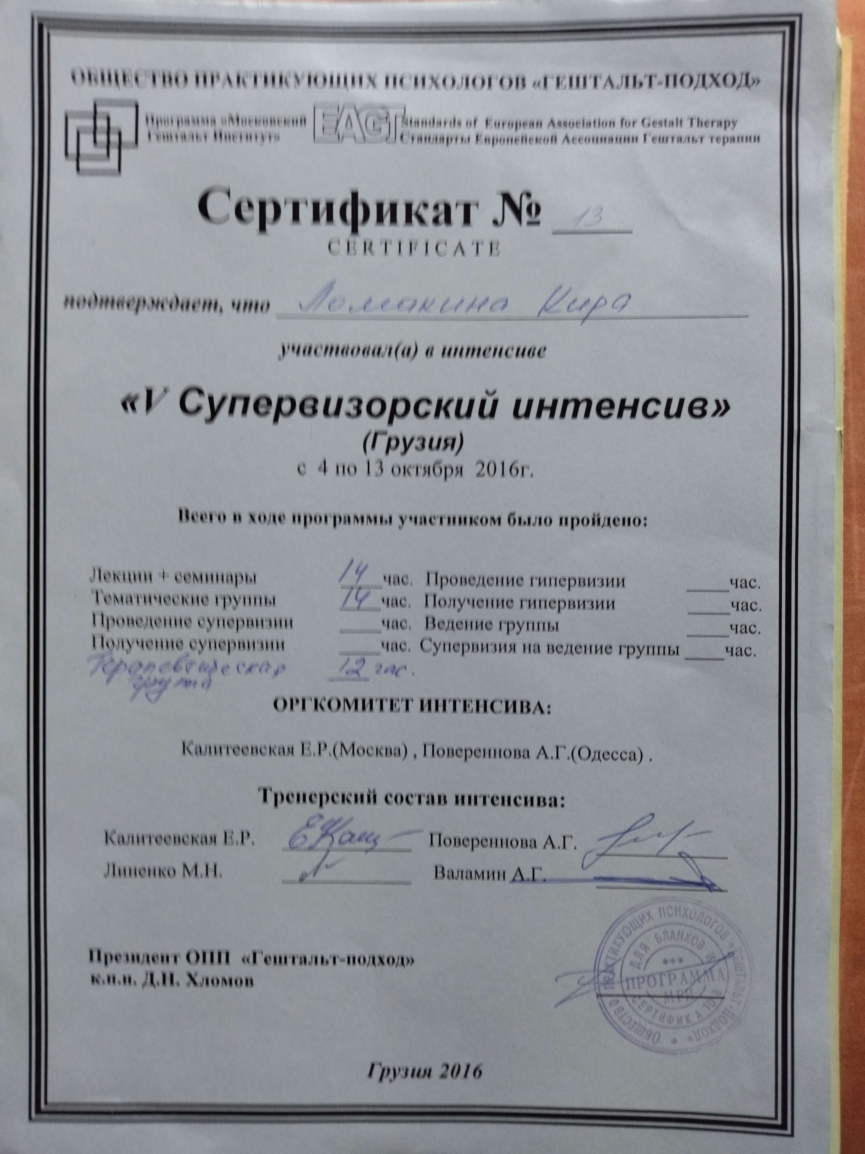 Межрегиональный институт гештальт терапии и искусства, супервизор. 2013