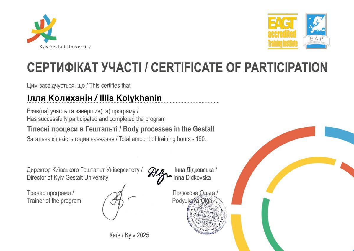 Обучение в гештальт-подходе, тематические программы работы с отношениями, осознанием, эмоциональной регуляцией. Регулярное повышение как часть профессиональной этики. Имею специализацию