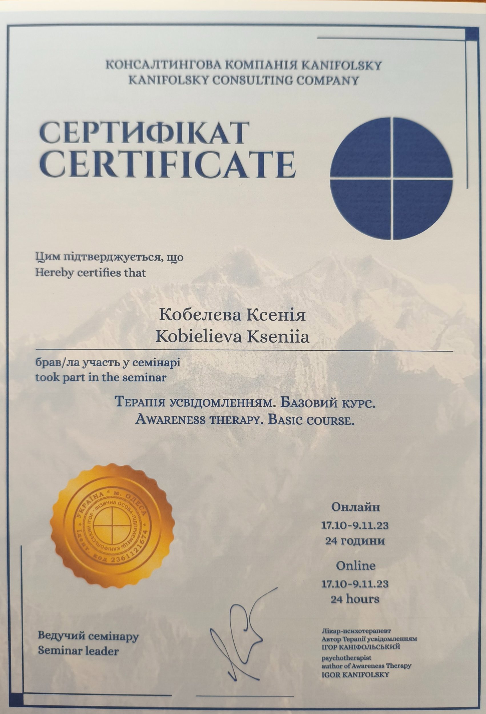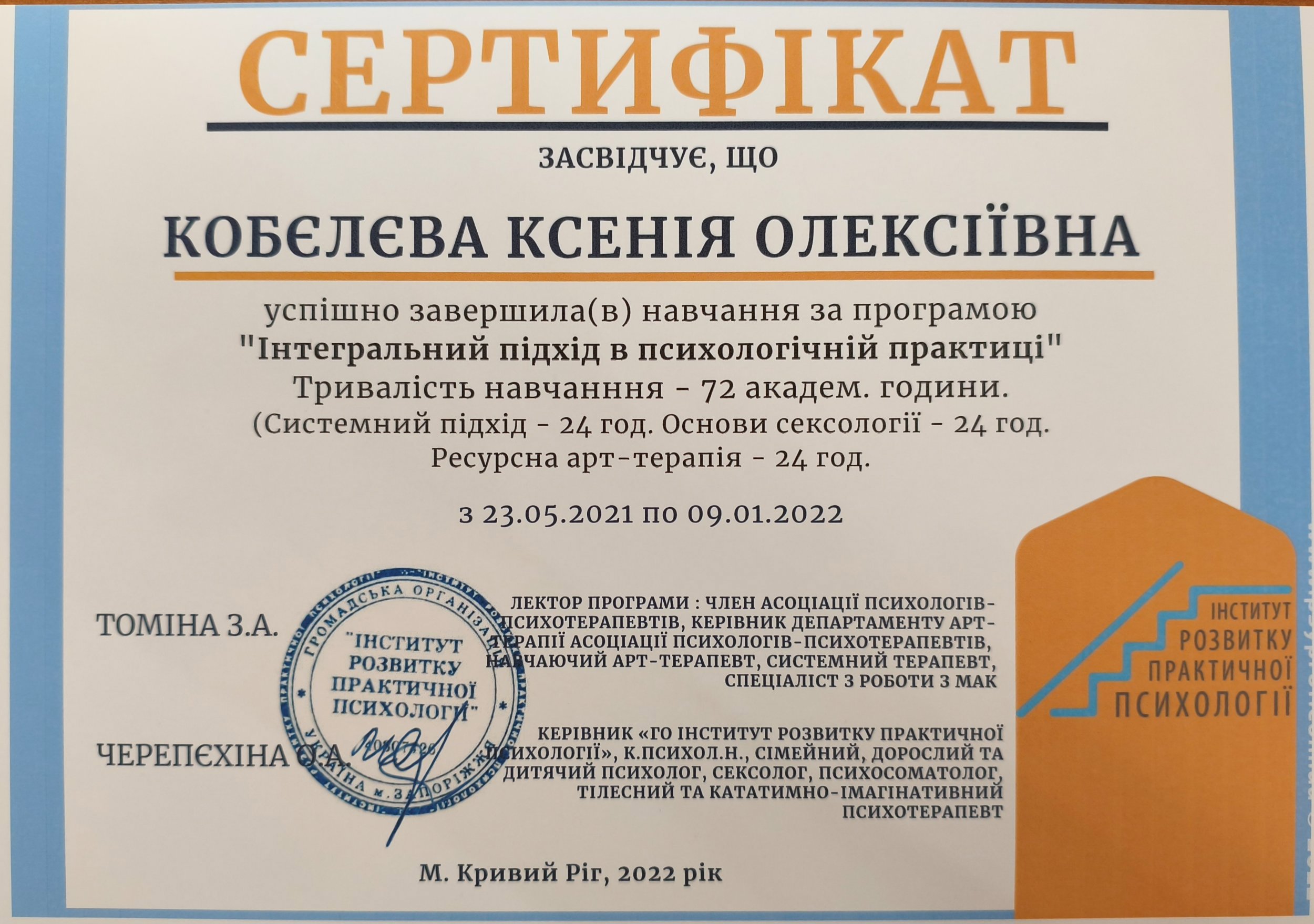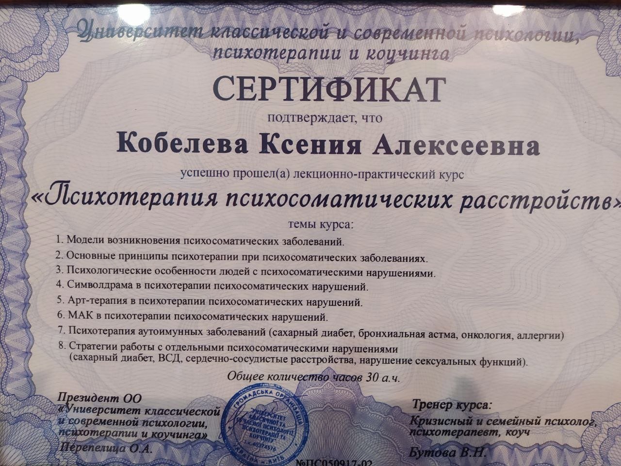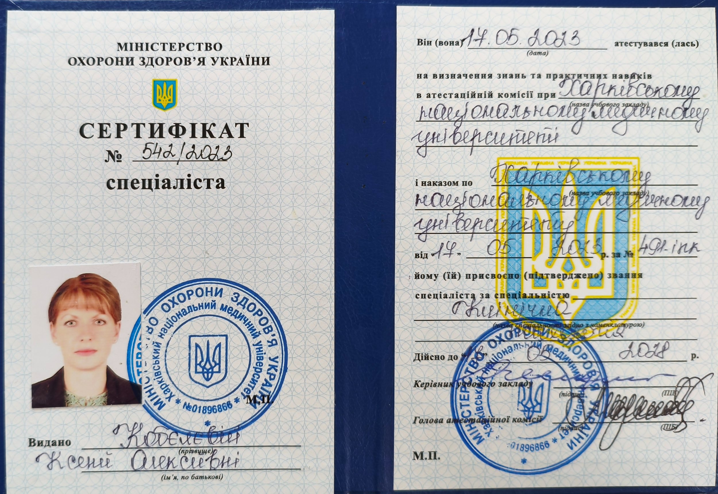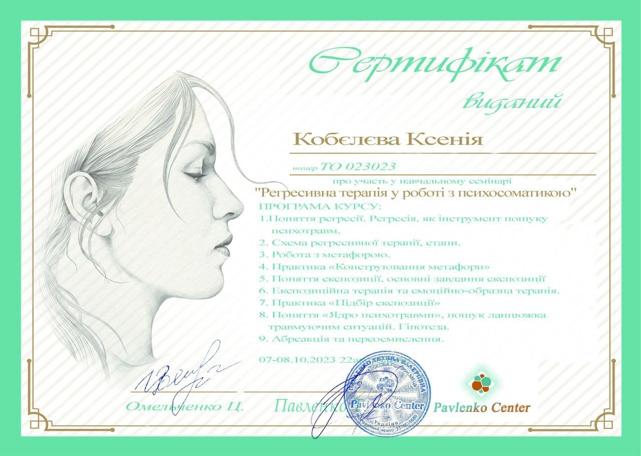 • Удостоверение СПЕЦ №01896866/000542-23 о прохождении повышения квалификации к диплому №КВ34729888 специализация «Клиническая психология» Харьковский национальный медицинский университет ННИПО от 17.05.2023г