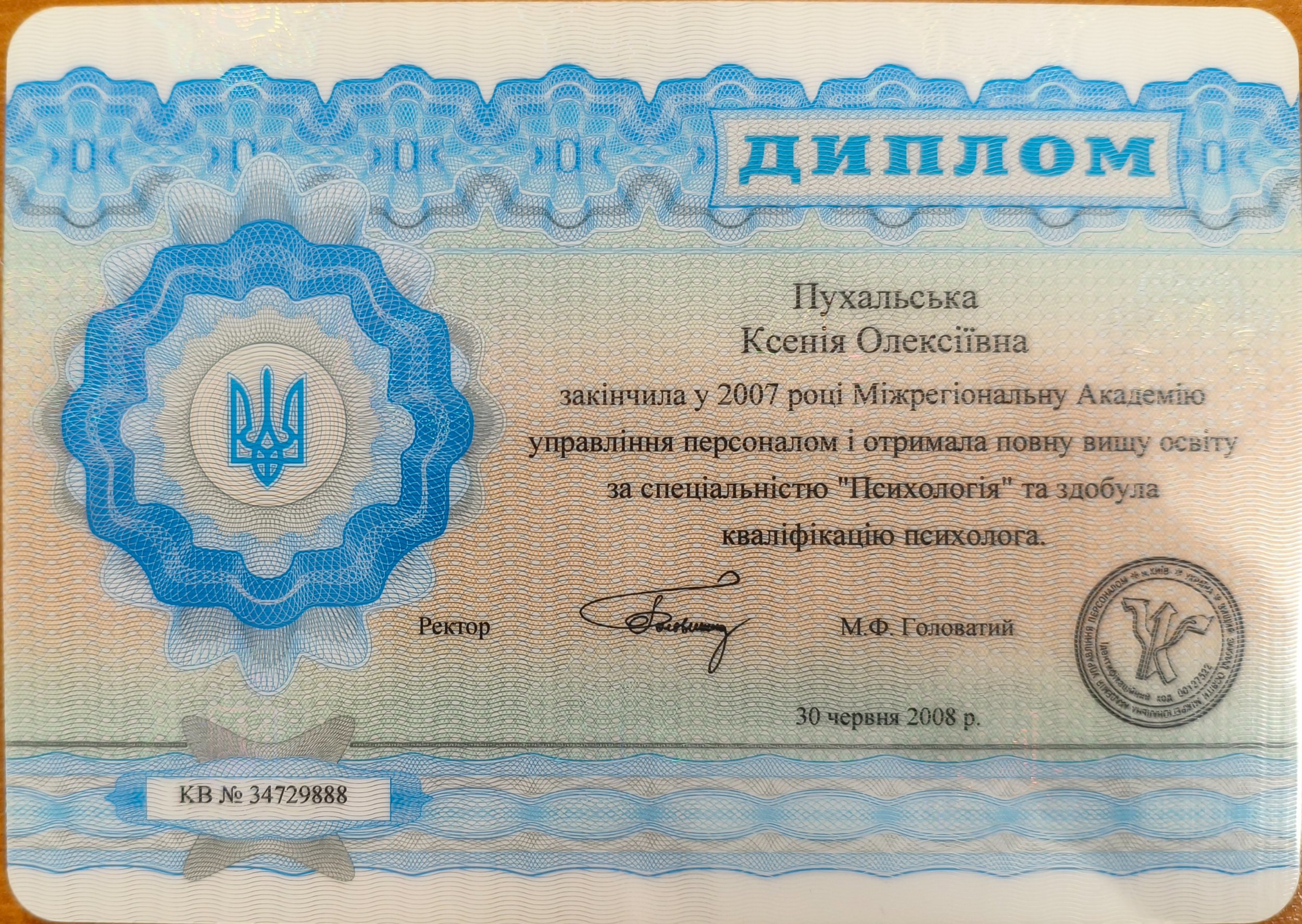 • Окончила в 2007 году МАУП и получила полное высшее образование по специальности «Психология» и получила квалификацию психолога КВ №34729888 от 30 июня 2008г.