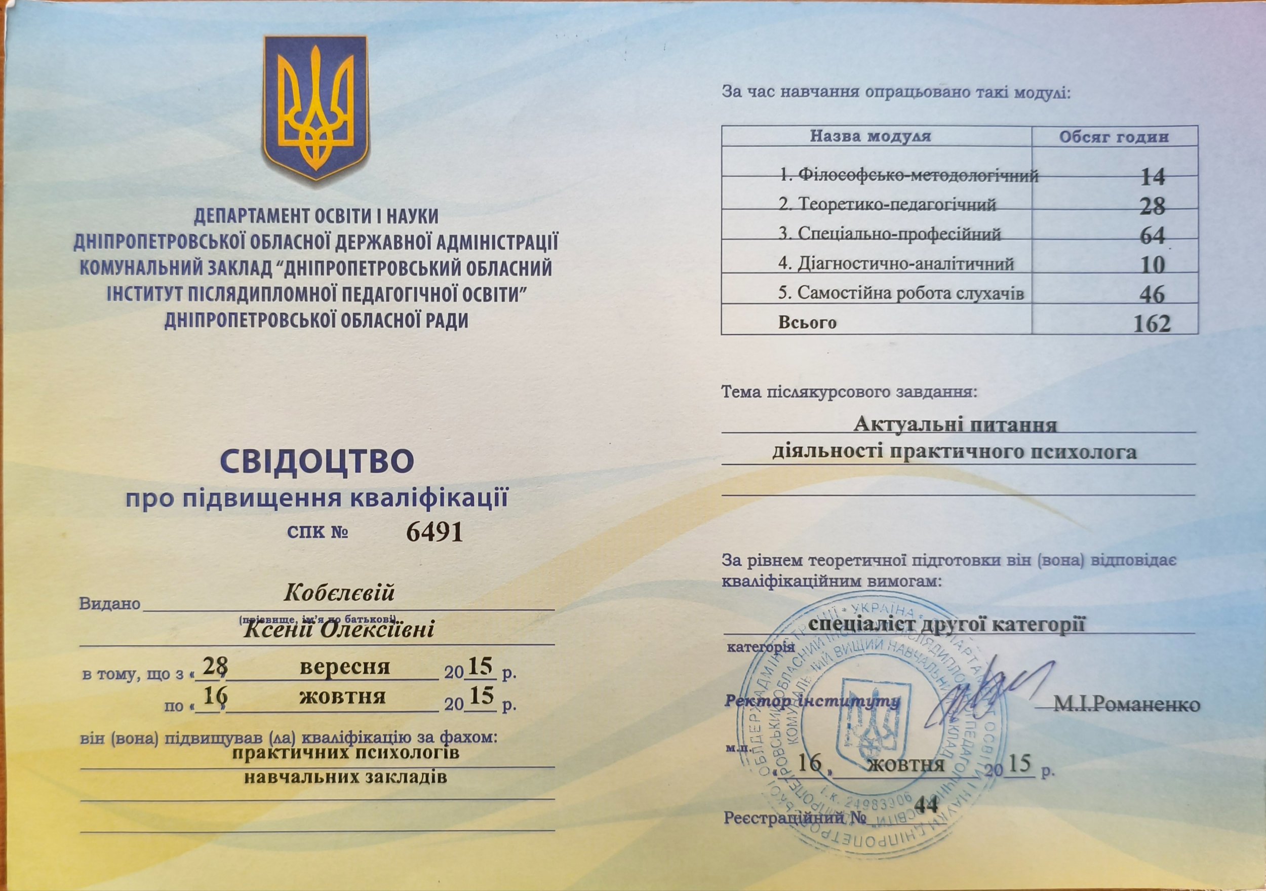 • Свидетельство о повышении квалификации №6491 от 16.10.2015 – Специалист второй категории