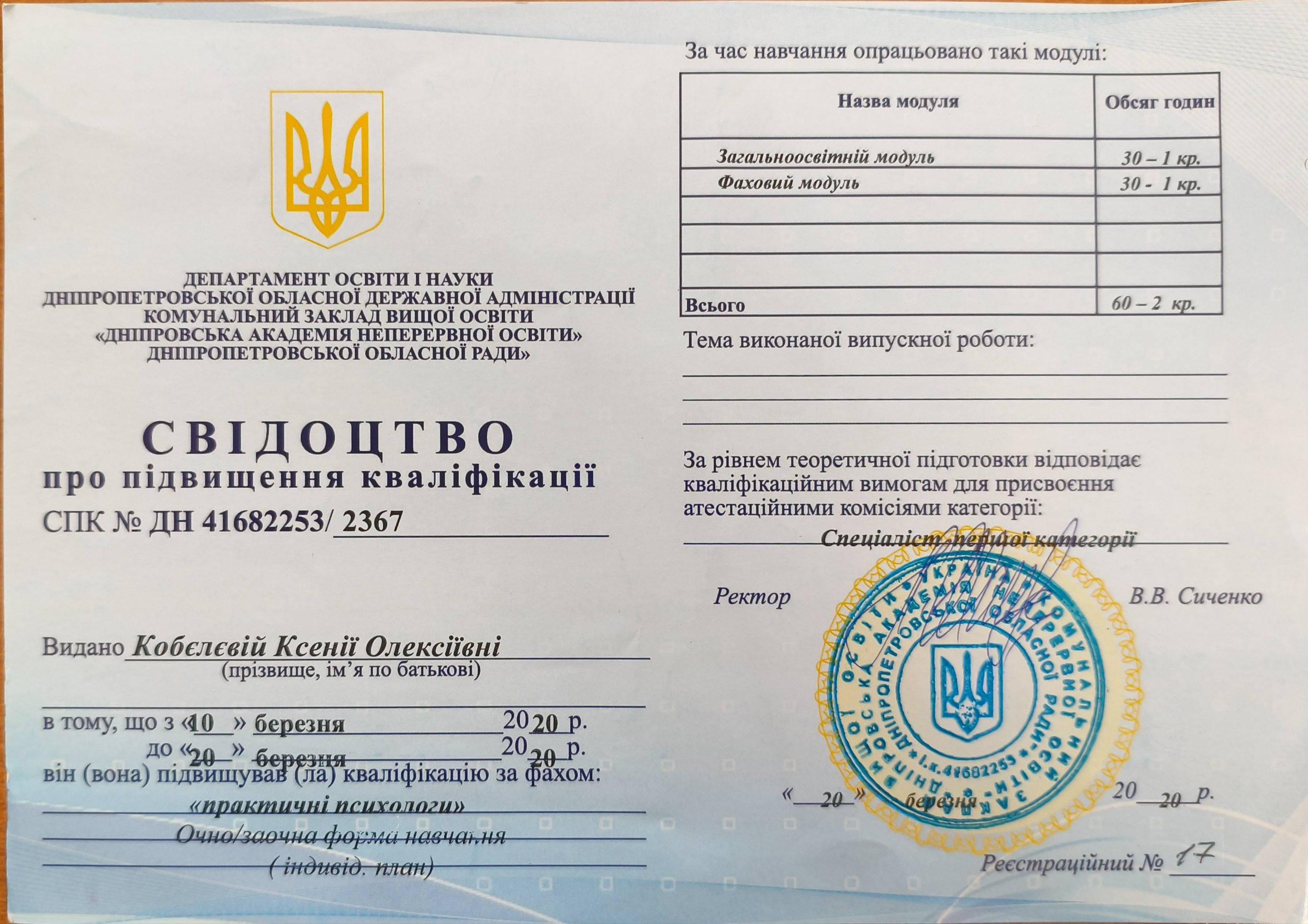 • Свидетельство о повышении квалификации №ДН 41682253/2367 от 20.03.2020 – специалист первой категории