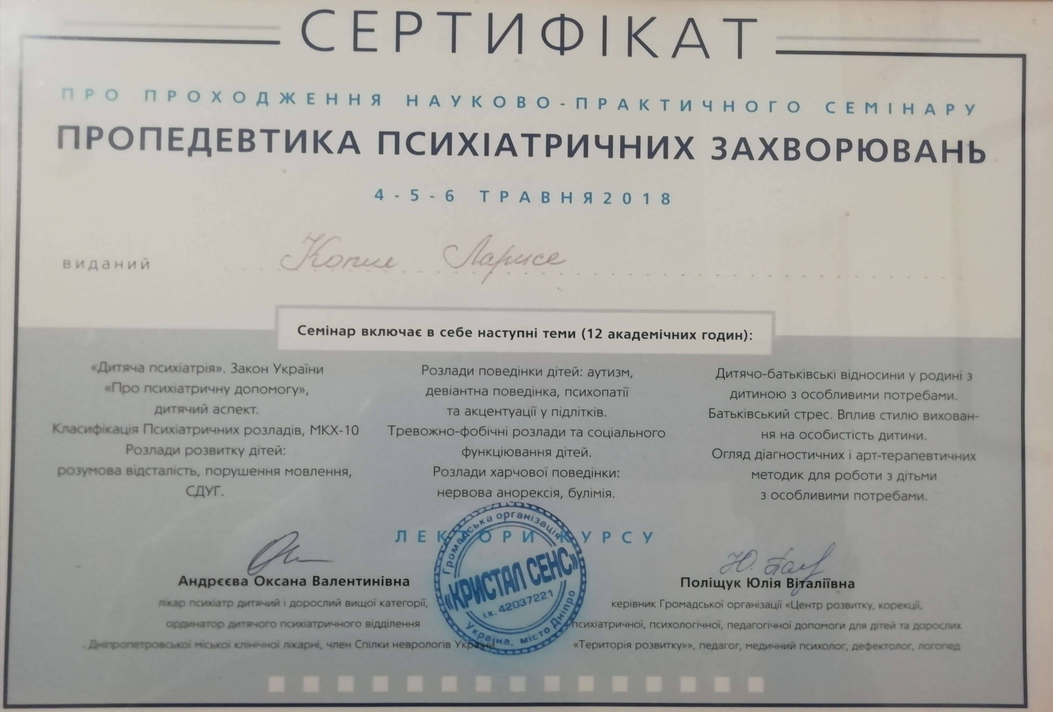 ОО "Кристалл смысл" Сертификат о прохождении научно - практического семинара "Пропедевтики психиатрических заболеваний" и "Расстройства психики"