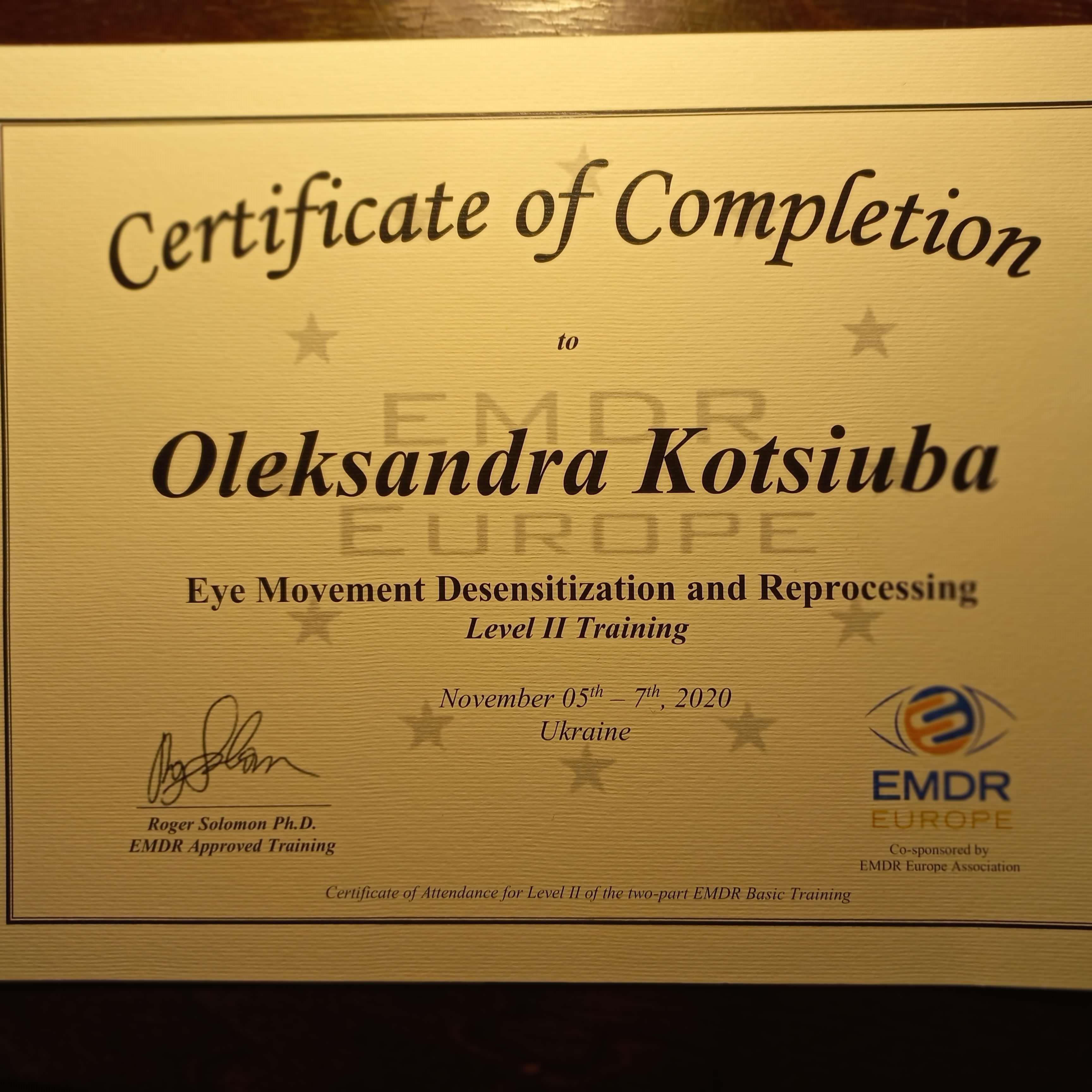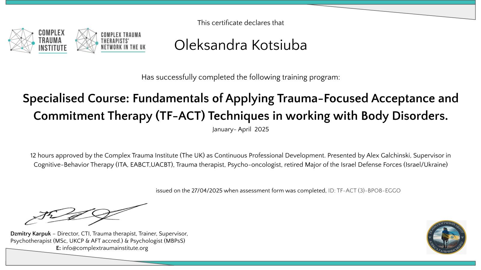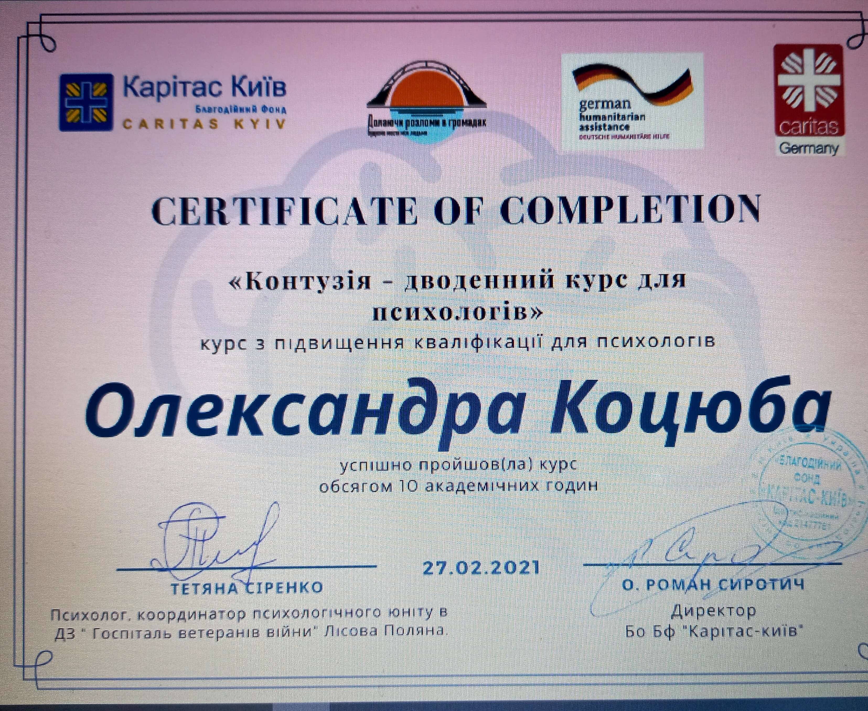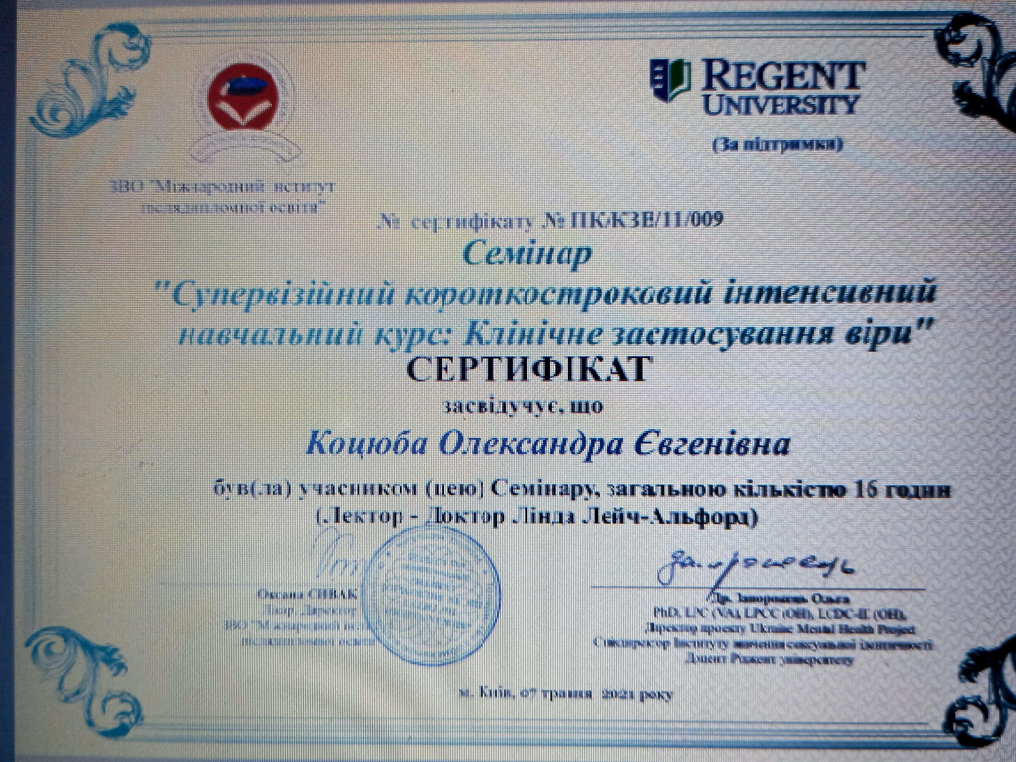 Киевский институт бизнеса и технологий по специальности "Психология". Международный институт последипломного образования по специальности "Травматерапия".