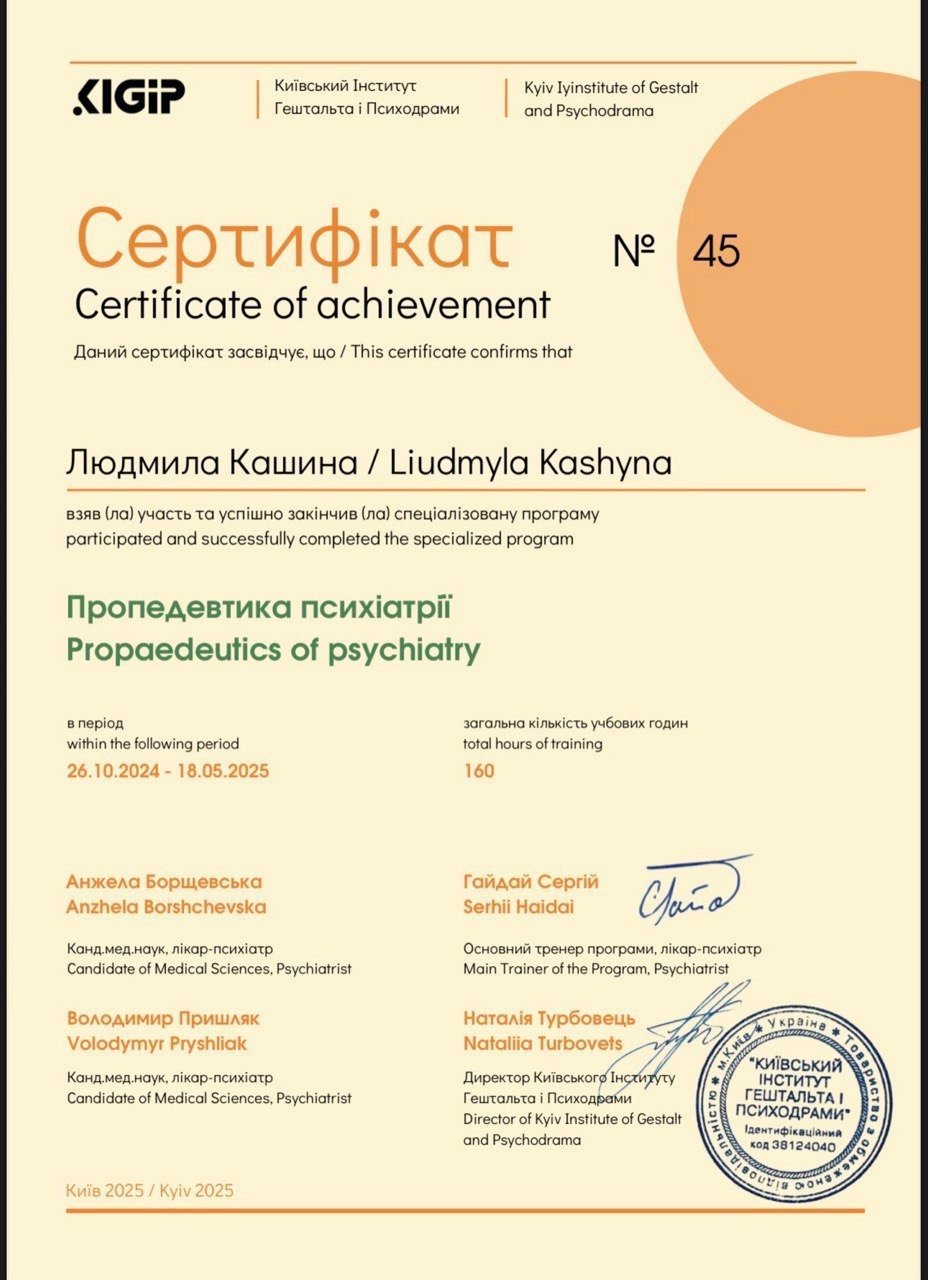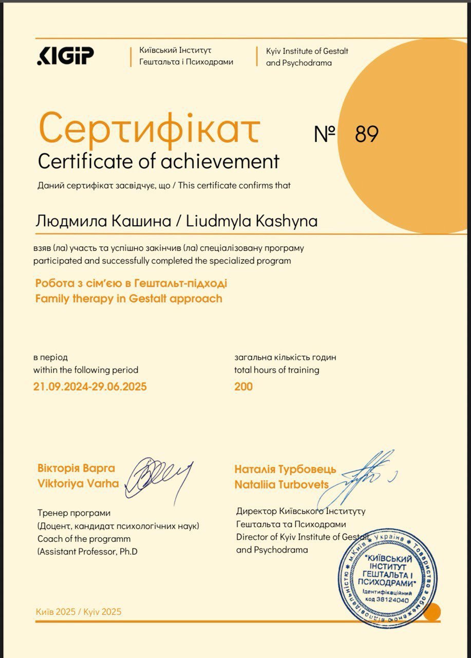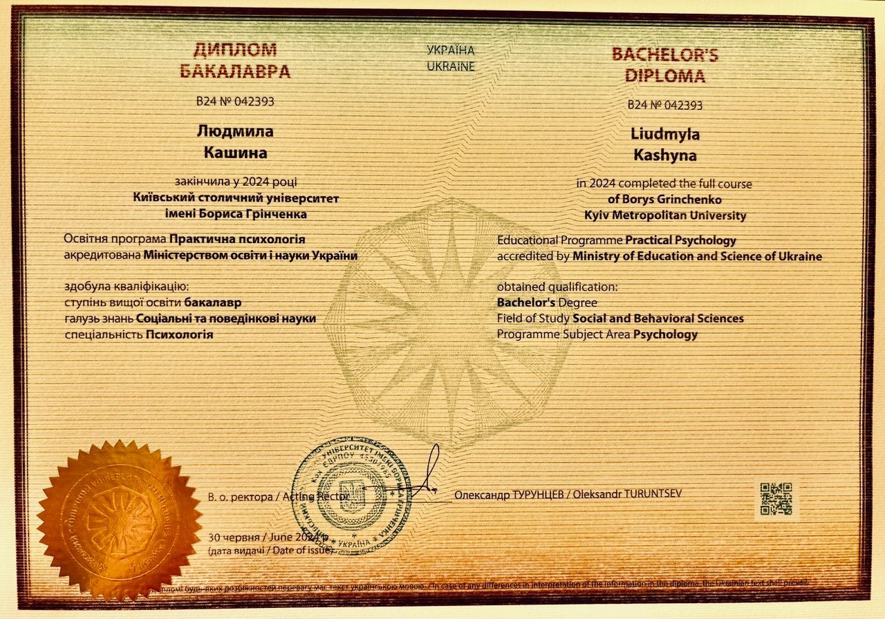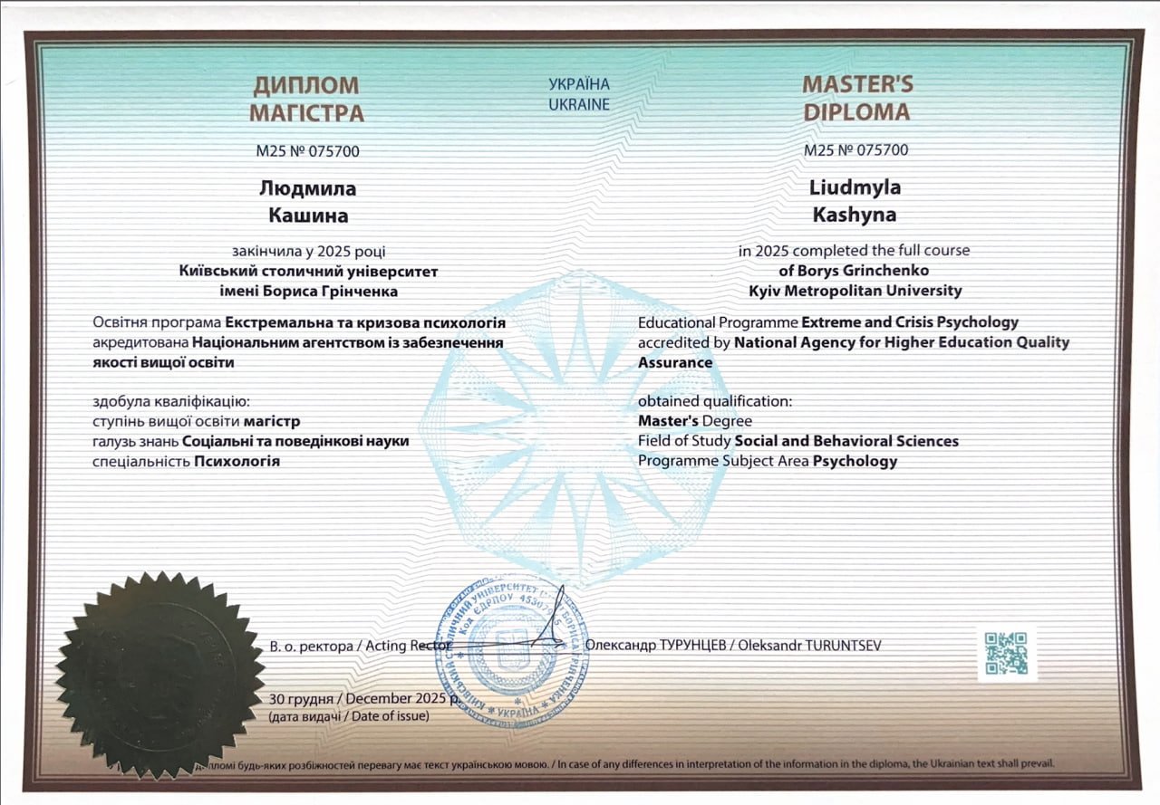 Свою учебу я начала в медицинском колледже и много лет работала в практических медицинах. Чувствует, что мое призвание это помощь людям. Но пока ты не исцелишь себя, ты не сможешь помочь другим. Получила диплом бакалавра Киевского столичного института имени Бориса Гринченко. В этом же вузе получила степень магистра по экстремальной и кризисной психологии. Успешно окончила специализацию по работе с семьями и пропедевтику для психологов. Окончила 5 лет учебы и сейчас сертифицируюсь как Гештальт терапевт. Постоянно имею личную терапию и супервизионную поддержку.