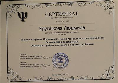 Запорожский Национальный Университет ЗНУ, магистратура, Магистр Психологии; КГУ 2 ступень Гештальта (2 год обучения)