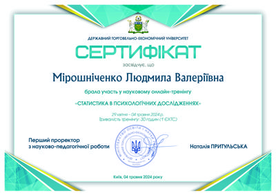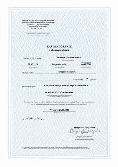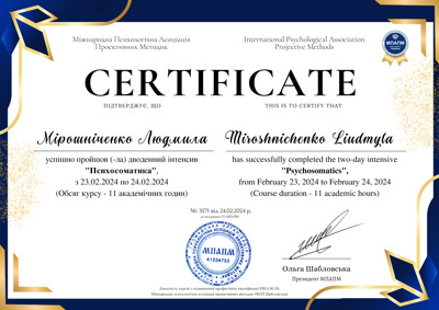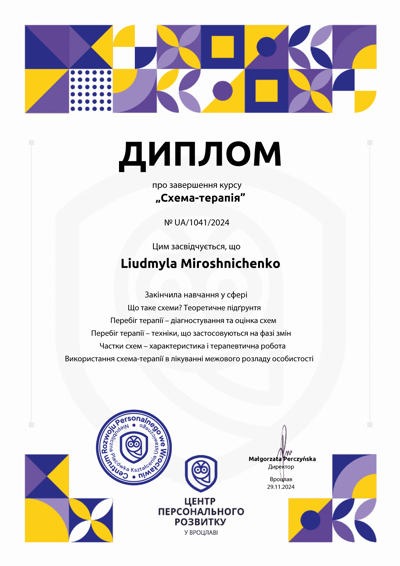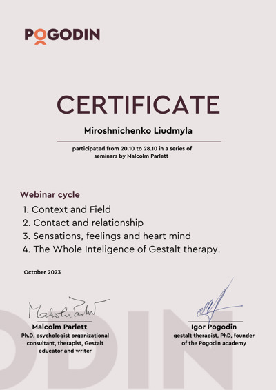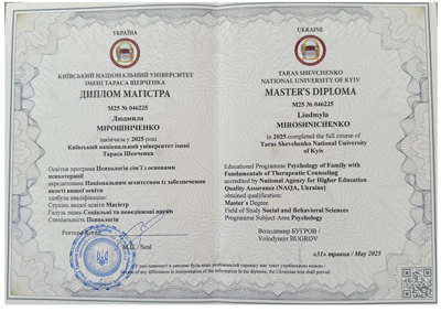 Магистр психологии (КНУ им.Шевченко), готовлюсь к сертификации как гештальт-терапевт (академия Погодина), имею сертификаты по прохождению обучения по работе с семьями, с психосоматикой, травмой, детскими кризисами. Постоянно принимаю участие в ежегодных конференциях гештальт-терапевтов и интинсивах. Работаю под супервидением.