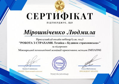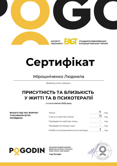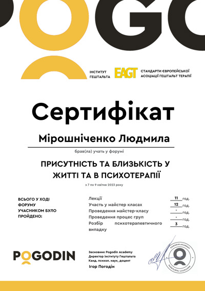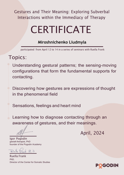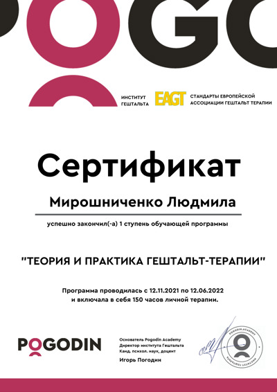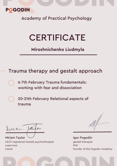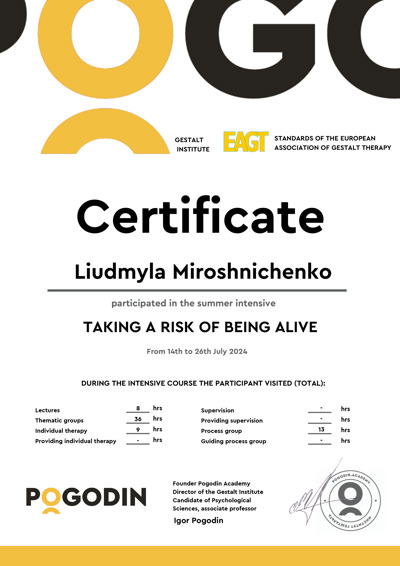 Есть сертификаты по прохождению обучения по работе с семьями, с психосоматикой, травмой, детскими кризисами. Постоянно принимаю участие в ежегодных конференциях гештальт-терапевтов и интинсивах.