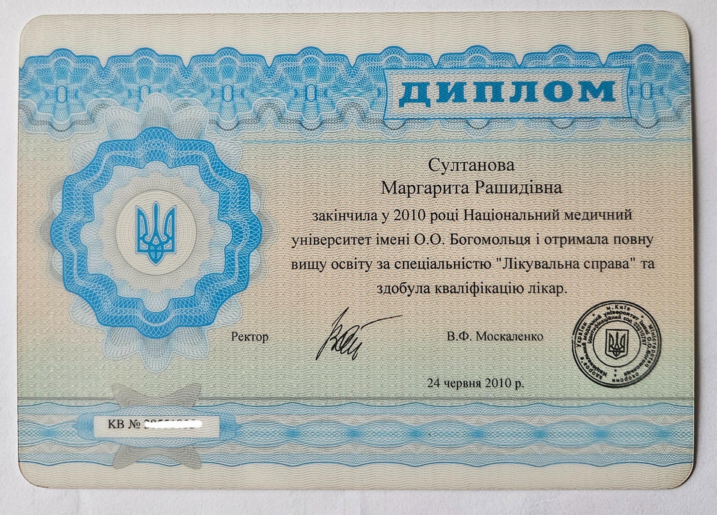 Высшее медицинское образование, специальность «лечебное дело», 2003–2010 гг.