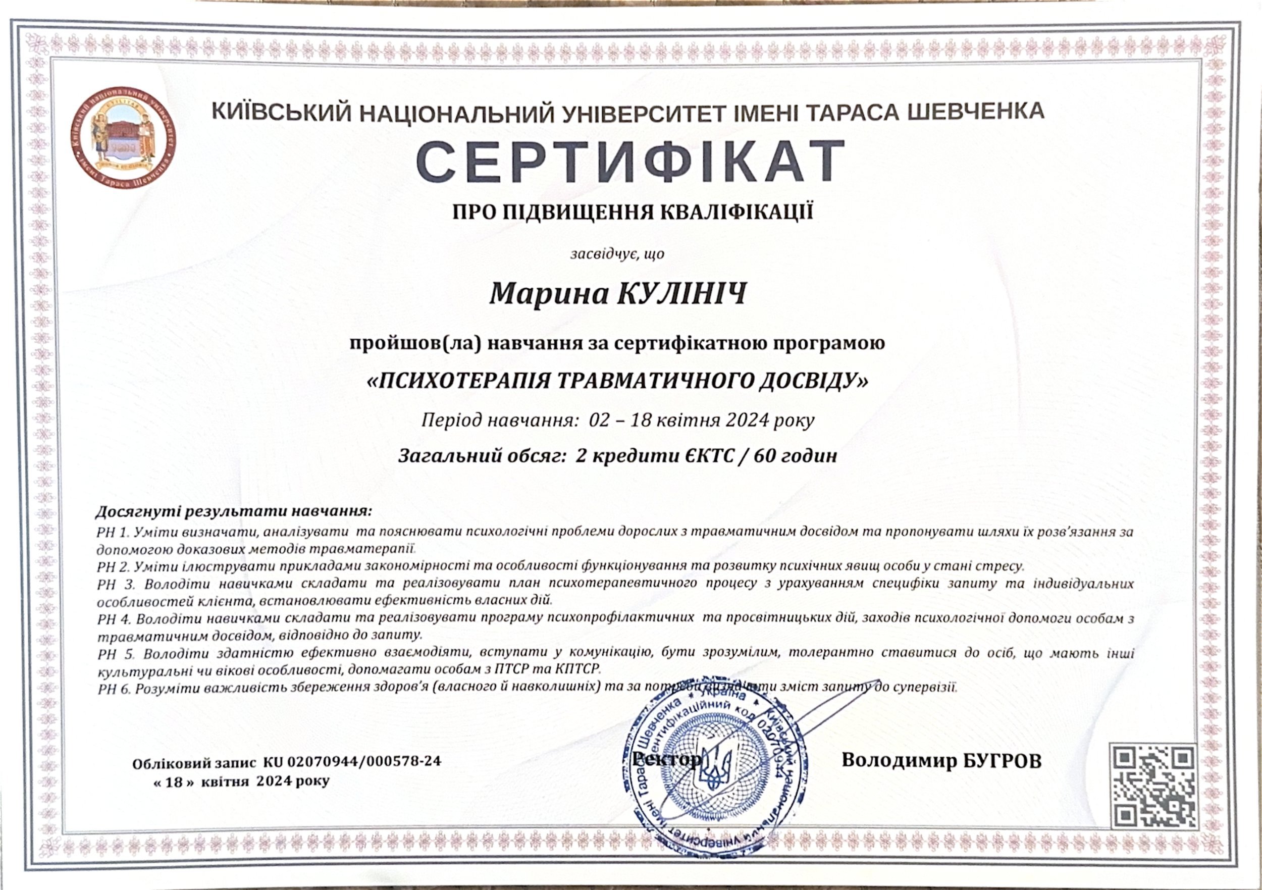 – 2024 г. – «Психотерапия травматического опыта», Киевский национальный университет имени Т. Шевченко;