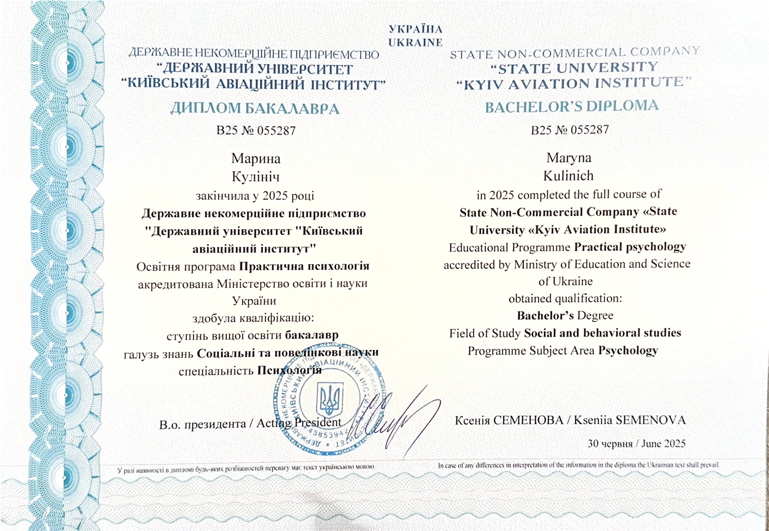 2022 – 2025 – Бакалавр практической психологии, Национальный авиационный университет.