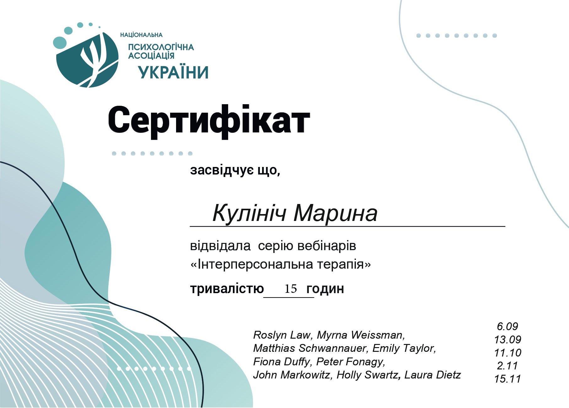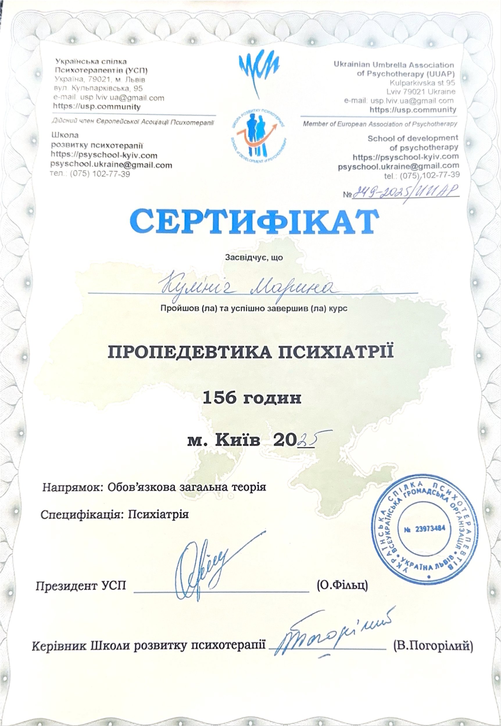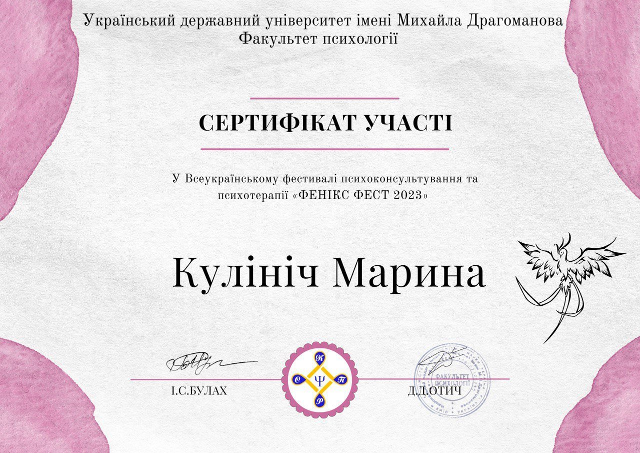 – 2023 г. – «Интерперсональная терапия», Национальная психологическая ассоциация Украины;