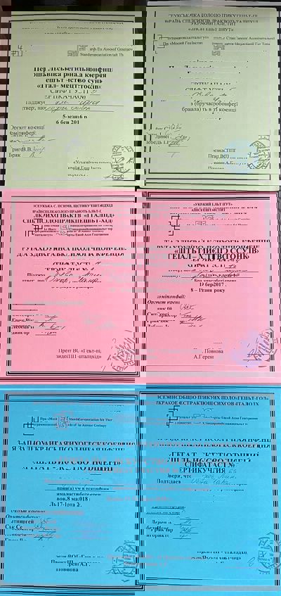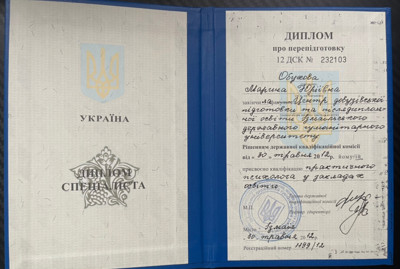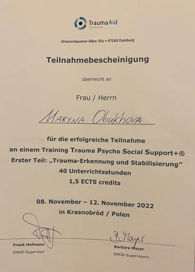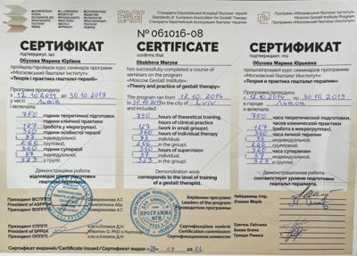 Украинский гештальт институт (программа «МГИ») – закончила 2 степень, успешно сертифицирована как гештальт-терапевт, обучаюсь на 3 степени. Специализация: «Гештальт-подход в работе с семьей и детьми».
