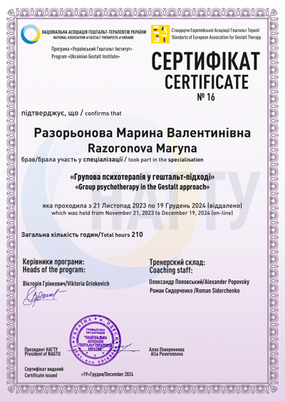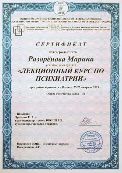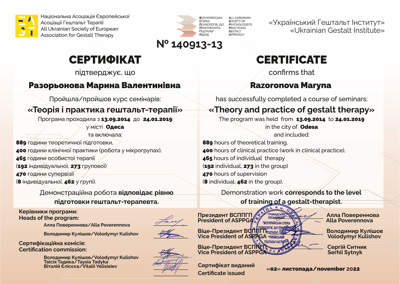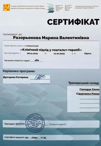 Прошла программа первой и второй ступени подготовки гештальт-терапевтов и сертифицировалась.