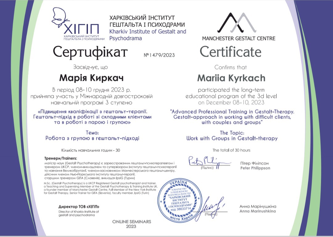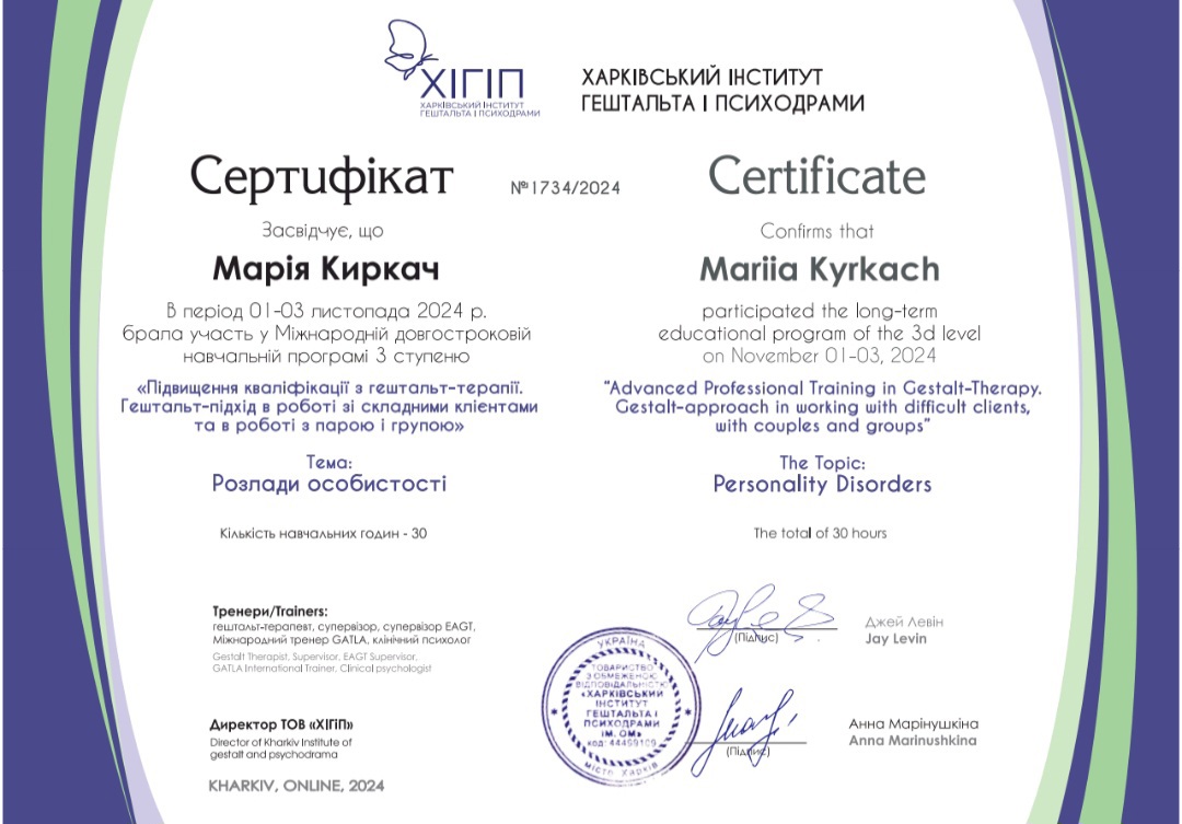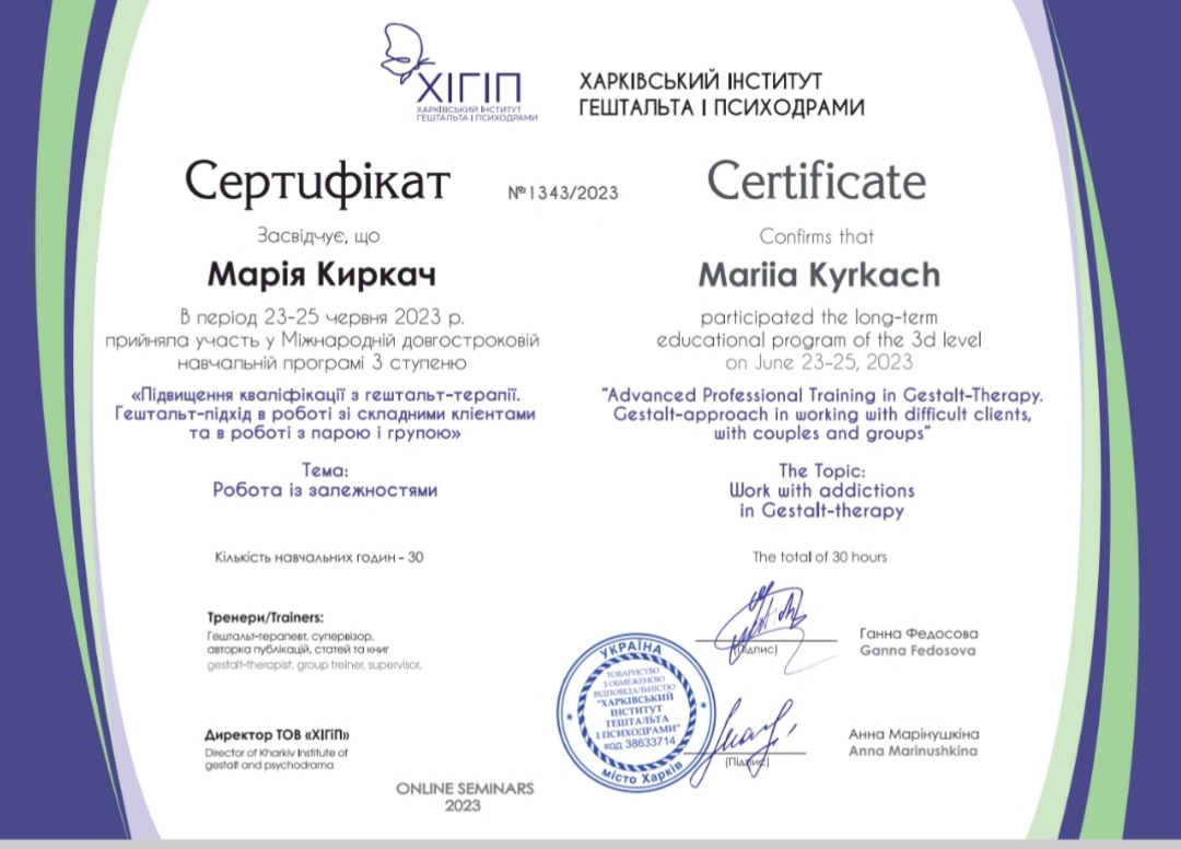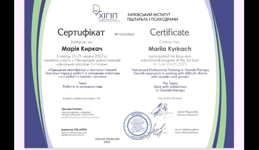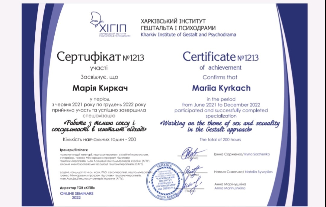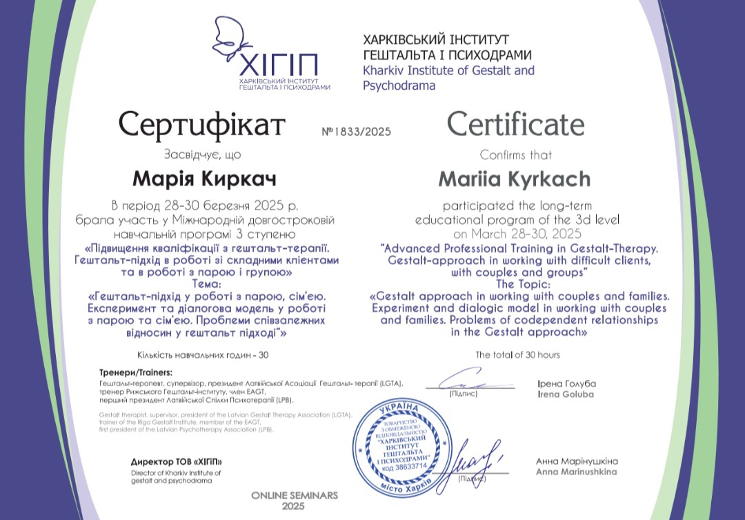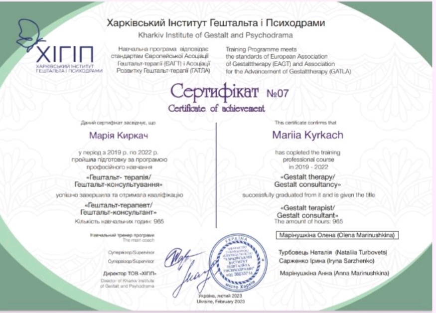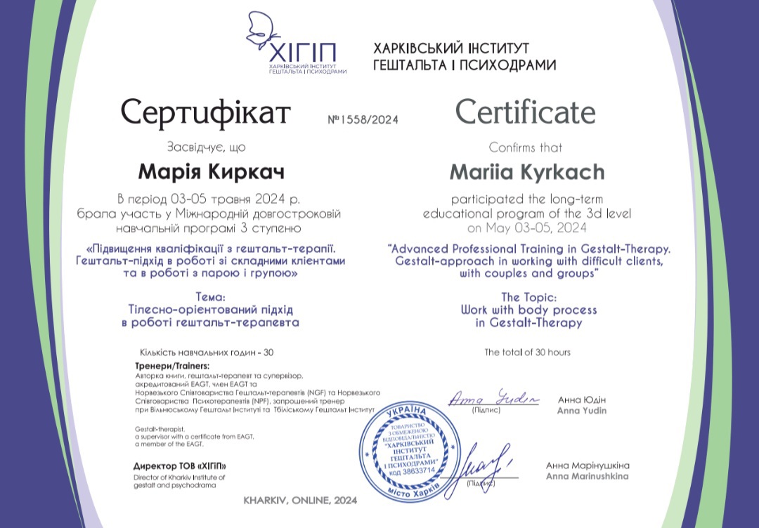Диплом психолога в Харьковском национальном университете им. Каразина, сертифицированный психотерапевт в Харьковском институте гештальта и психодрамы, специализация в семейной проблематике, специализация в теме секса и сексуальности в гештальт подходе, специализация в телесном процессе, специализация в созависимых отношениях, специализация в психопропедевтике психиатрии, специализация в ведении заканчиваю 3 степень гештальттерапии в ХИГИПе