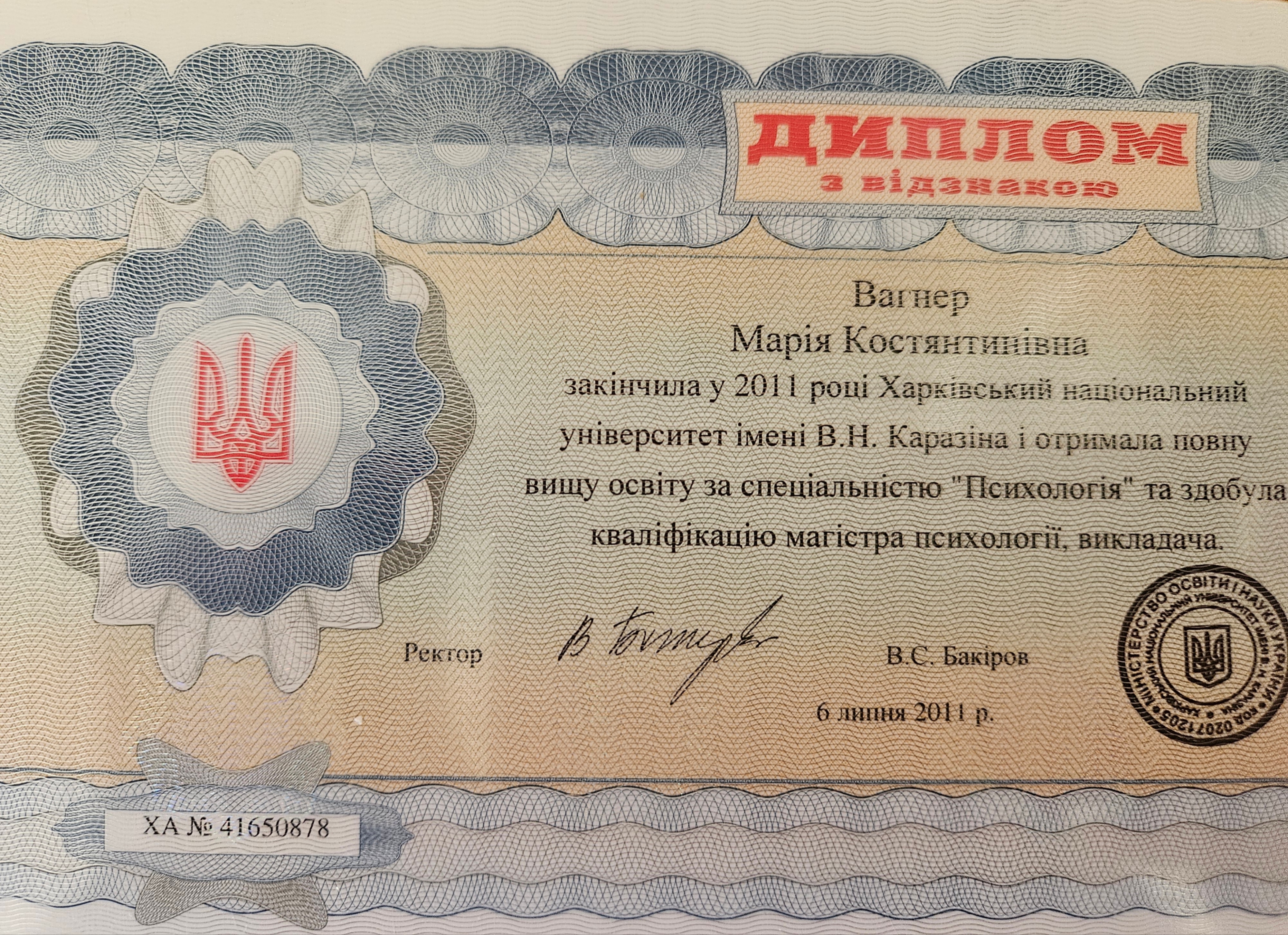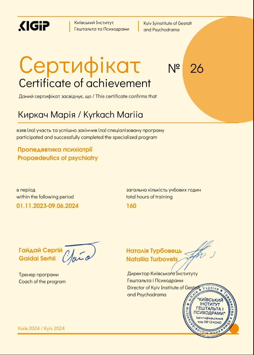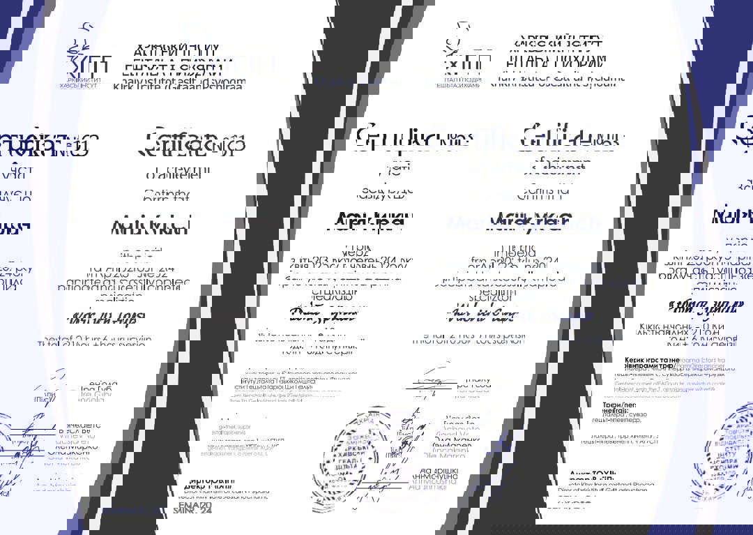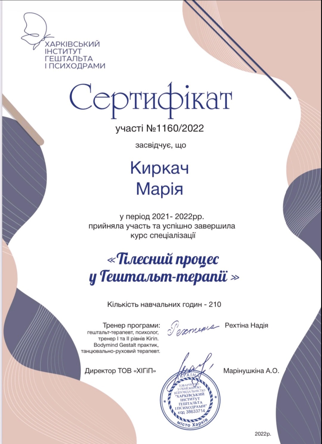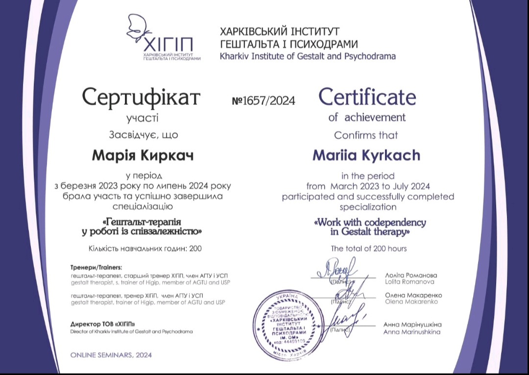 Диплом психолога в Харьковском национальном университете им. Каразина, сертифицированный психотерапевт в Харьковском институте гештальта и психодрамы, специализация в семейной проблематике, специализация в теме секса и сексуальности в гештальт подходе, специализация в телесном процессе, специализация в созависимых отношениях, специализация в психопропедевтике психиатрии, специализация в ведении заканчиваю 3 степень гештальттерапии в ХИГИПе