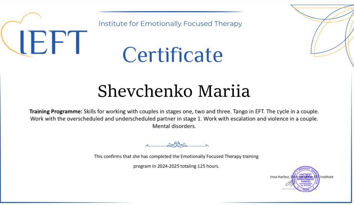 Я практикующий психолог - консультант Мария Шевченко, провожу очные (Киев) и онлайн консультации по всему миру.