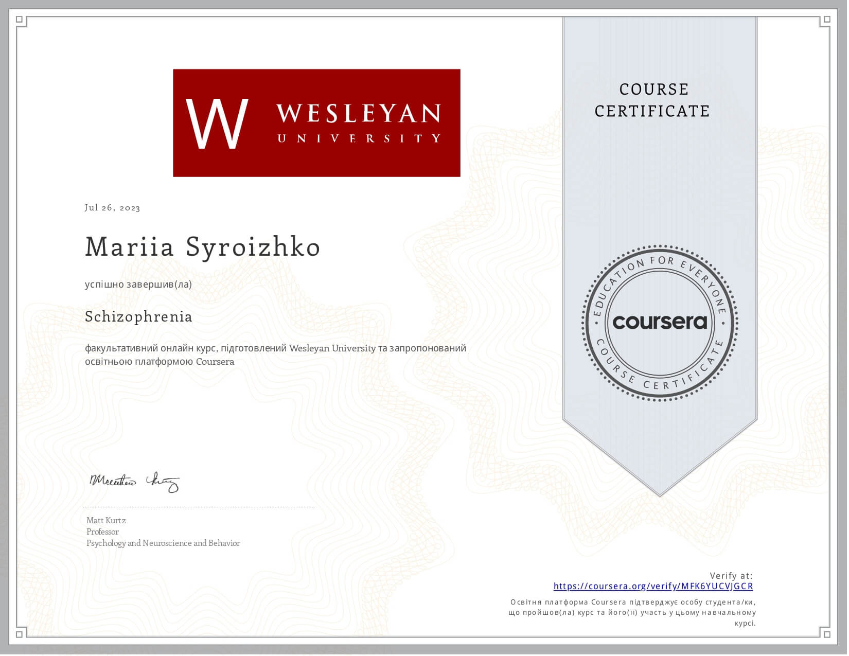 "Шизофрения", курс от Wesleyan University (10 часов)