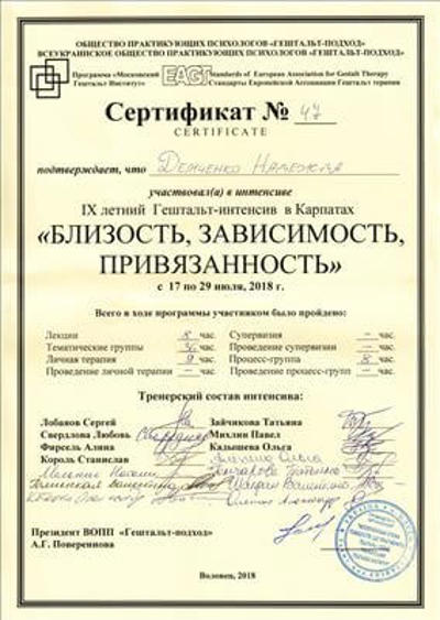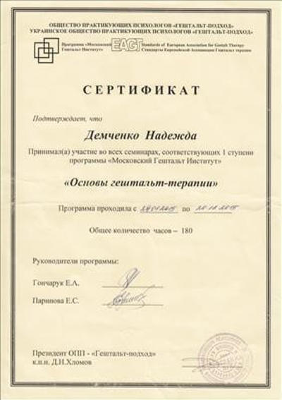 Окончила МГИ Гештальт Институт (Всеукраинское Гештальт Общество) и Горловский Педагогический Институт Иностранных Языков (ИНЯЗ).