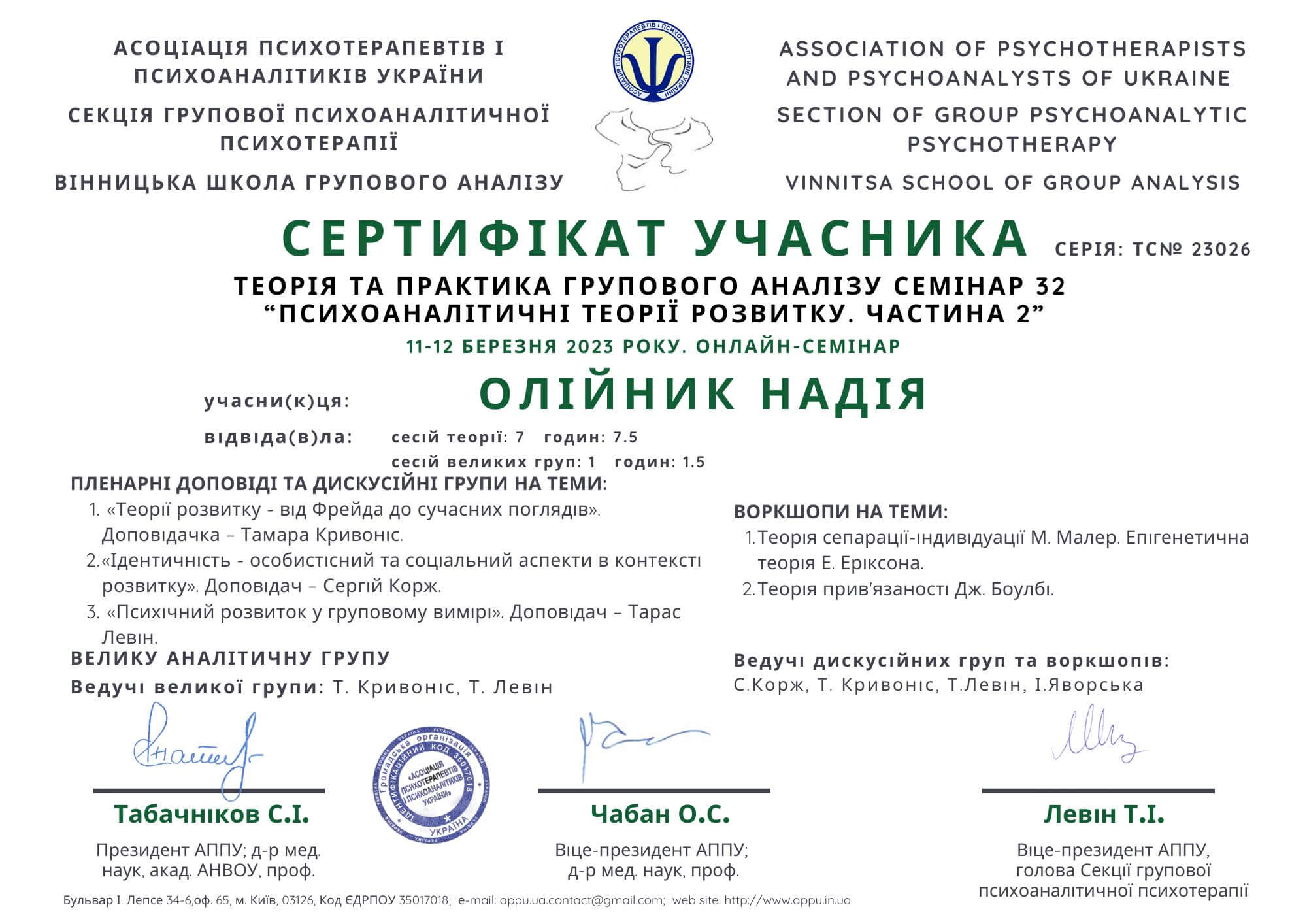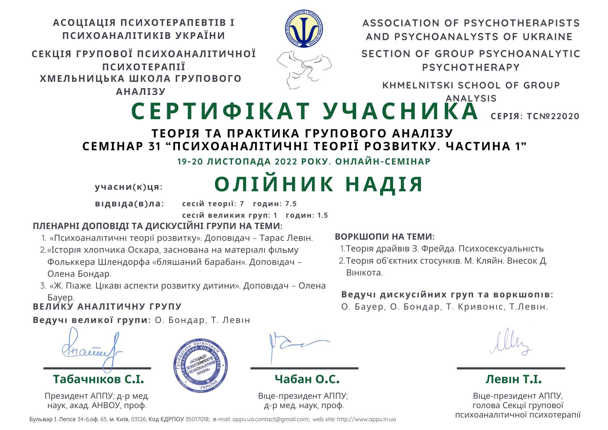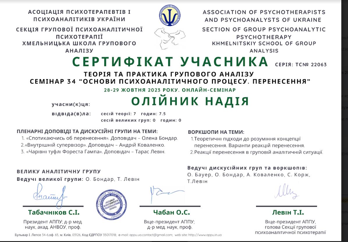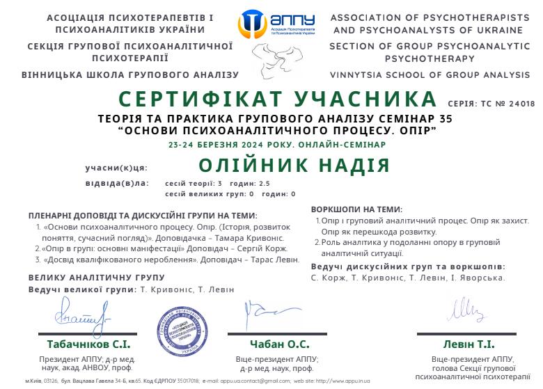 АСОЦІАЦІЯ ПСИХОТЕРАПЕВТІВ І ПСИХОАНАЛІТИКІВ УКРАЇНИ, ХМЕЛЬНИЦЬКА ШКОЛА ГРУПОВОГО АНАЛІЗУ