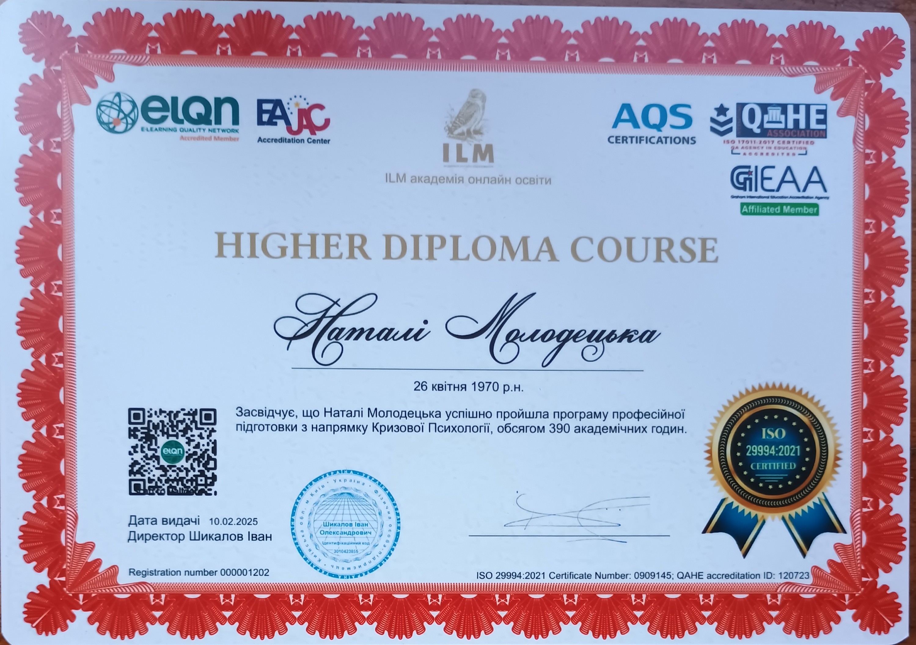 Профессиональная подготовка по направлению Кризисной Психологии в объеме 390 академических часов