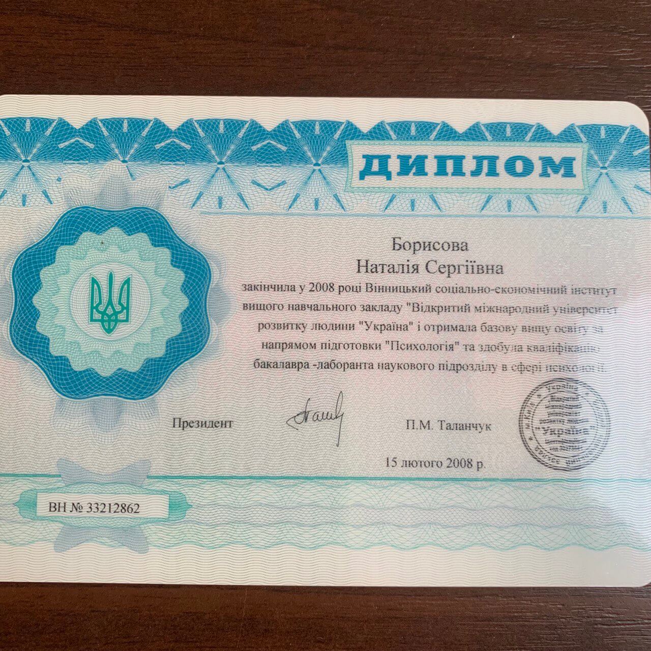 Оконченное высшее по психологии. 2003-2009 Винницкий социально-экономический институт высшего учебного заведения" Открытий международный университет развития человека Украина. Магистр психологии.