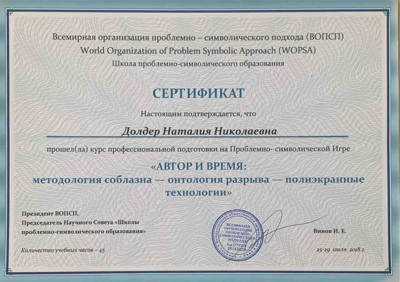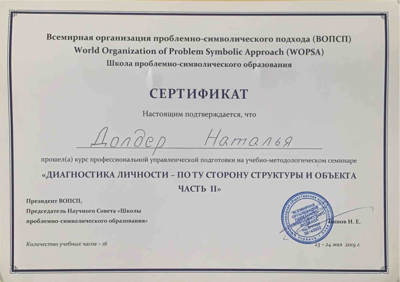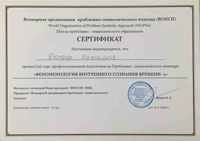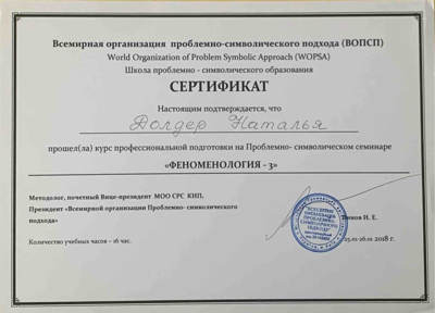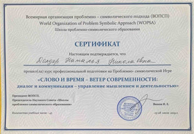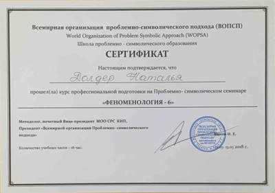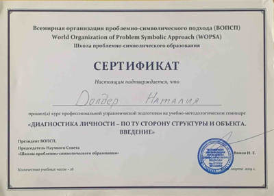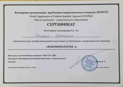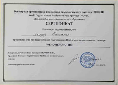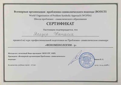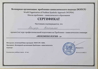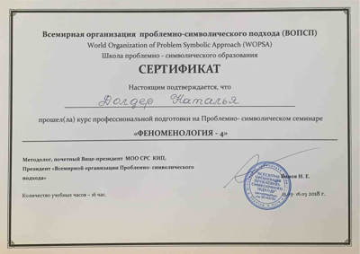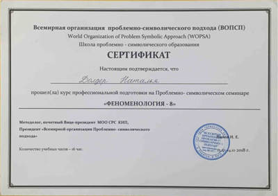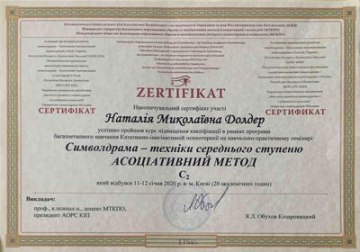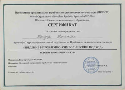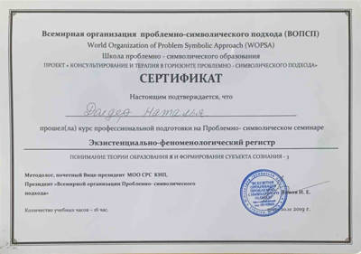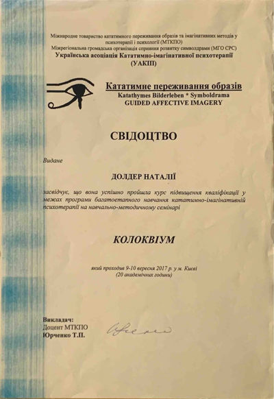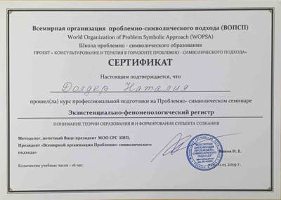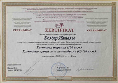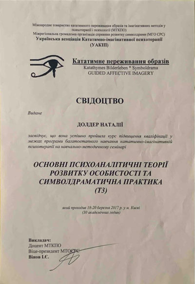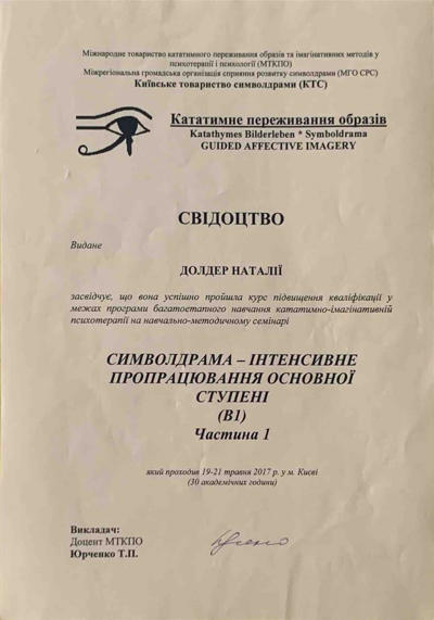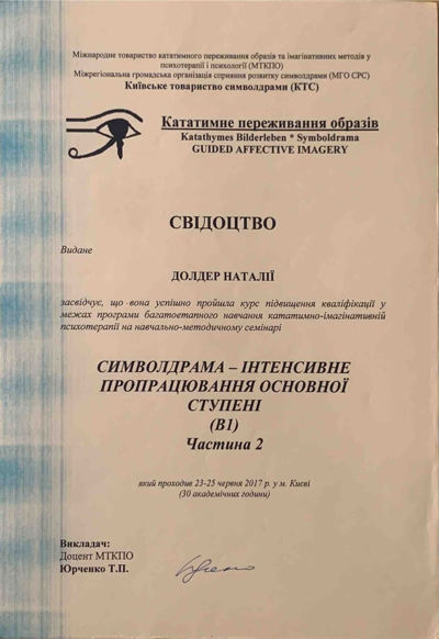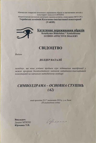 С 2016-2021 Межрегиональная общественная организация содействия развитию символдрамы - Кататимно- имагинавтивной психотерапии в России, Украине, Республики Беларусь, Казахстане (МОО СРС КИП) Украинская общественная организация «Институт развития символдрамы и глубинной психологии» Закончила обучение , готовлюсь к сдаче диплома.