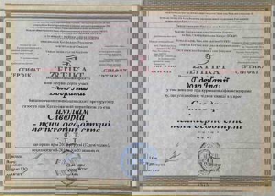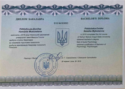 Закончила 2018 году Нежинский государственный университет им. Николая Гоголя приобрела квалификацию : степень высшего образования МАГИСТР , специальность Психология, образовательная программа Психология, профессиональная квалификация Преподаватель психологии. Психолог.
