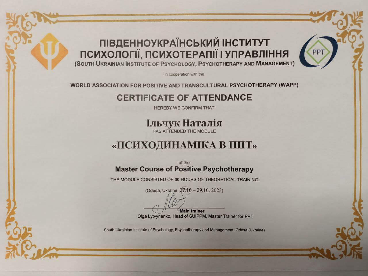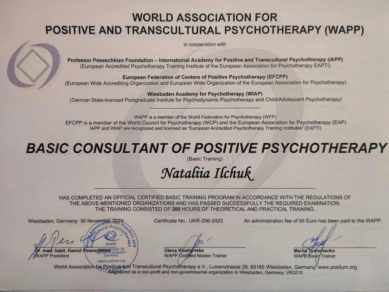 Базовый курс Позитивной и транскультуральной психотерапии, консультант по методу положительной психотерапии, 2023 г.
