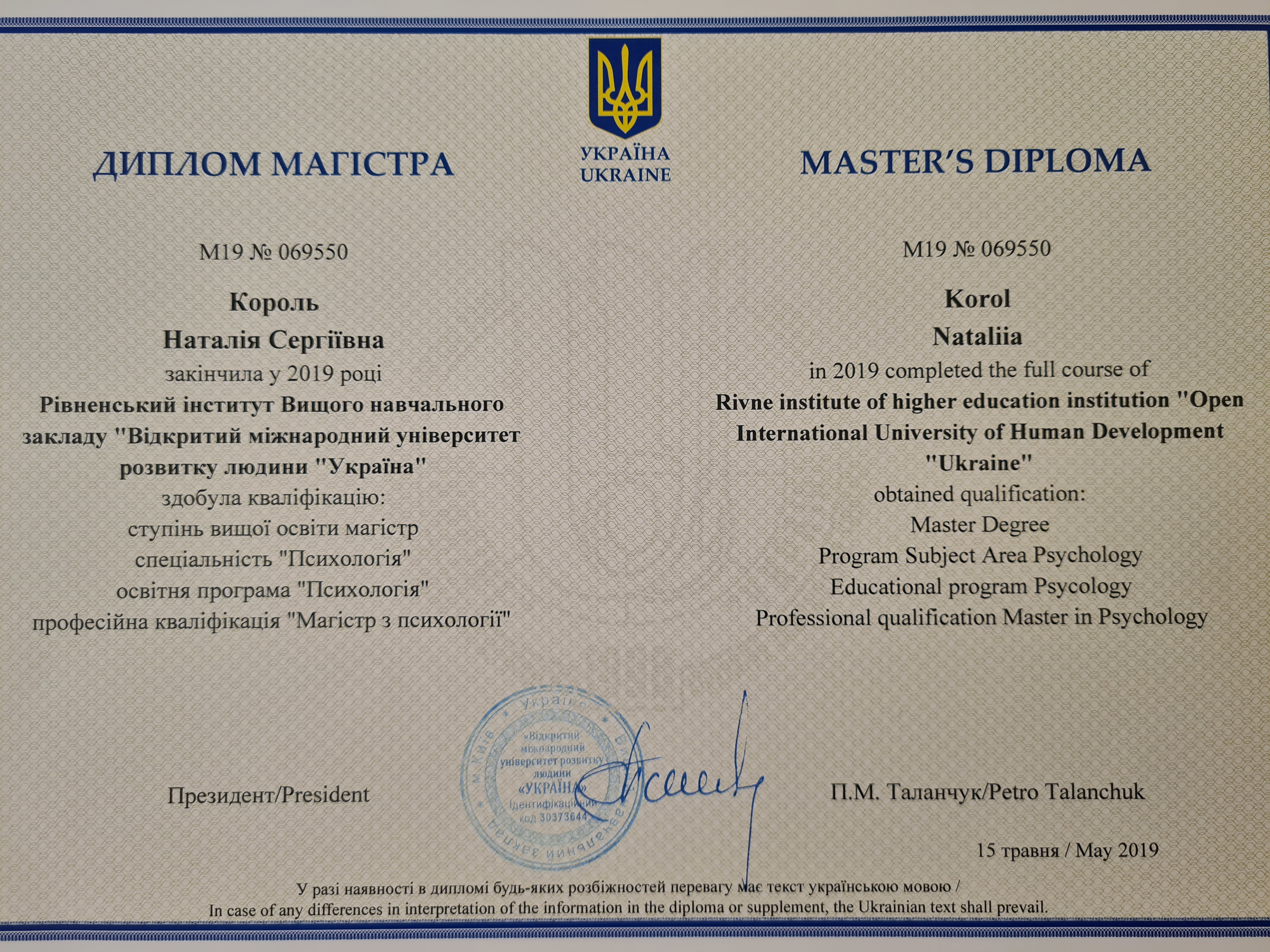 Училась в университете "Украина" магистр психологии, с 2019 г. сейчас учусь в Ровенской ячейке "Символдрамы"