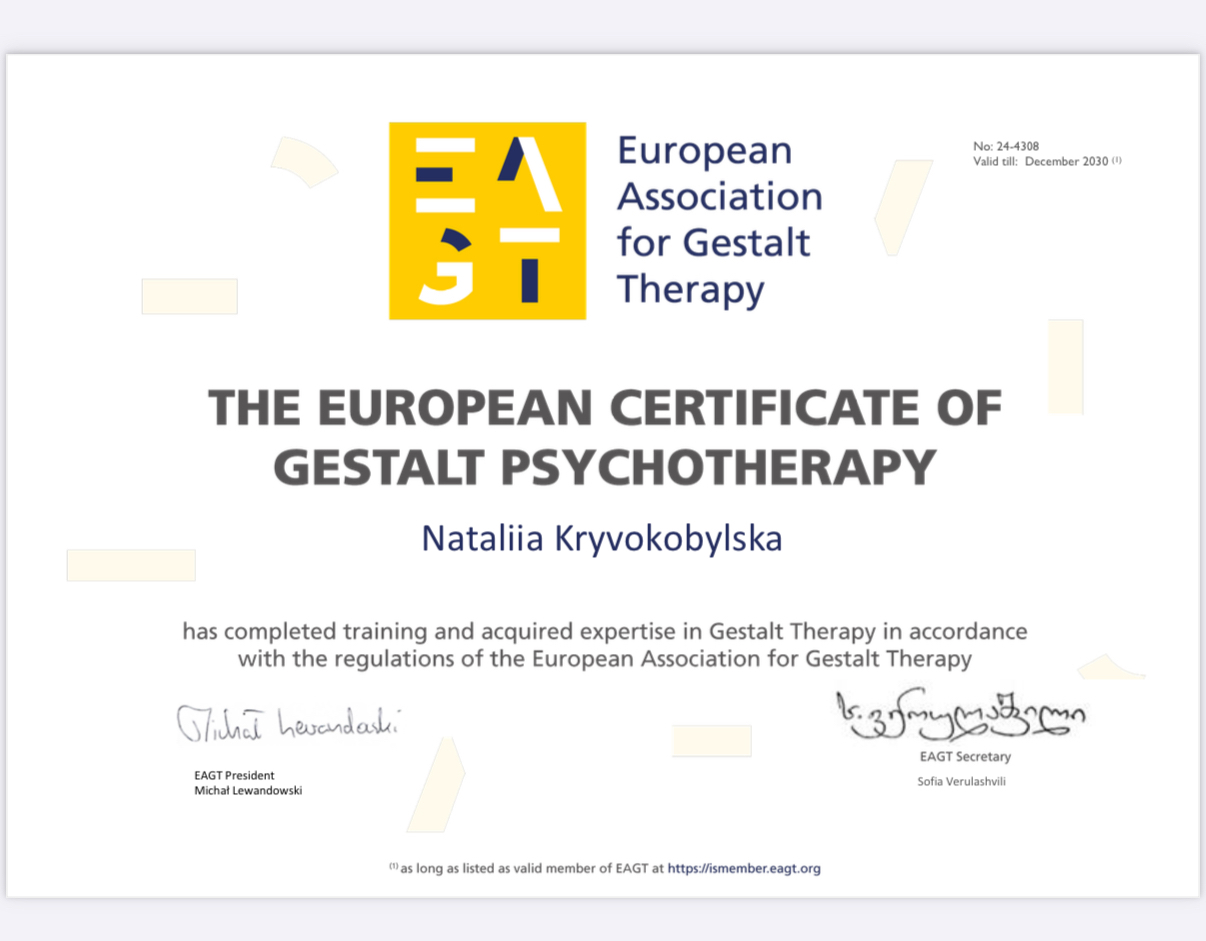 Я дипломированный психолог. Почти 20 лет назад я выбрала эту профессию, потому что хотела разобраться в себе, а также мне очень интересно было про людей и про отношения между людьми. И c годами этого интереса становится все больше и больше. С 2007 года в моей жизни появилась психотерапия, я начала обучение в клиент-центрированном направлении. С того времени я постоянно учусь, посещая различные конференции, семинары, интенсивы и т.д. С 2015 года по 2021 год я обучалась в долгосрочной программе по подготовке гештальт-терапевтов Киевского Гештальт Университета, закончила 1 и 2 ступени. Долгое время мое обучение было больше для себя, чем для работы. Обучаясь в группах на личном опыте и проходя личную терапию, я развивалась и продолжаю развиваться личностно, а также развиваю свои профессиональные навыки, это дает мне возможность чувствовать на личном опыте как работает тот или иной метод, техники и вобщем психотерапия. Сейчас у меня уже есть достаточно профессионального и внтуреннего рессурса, чтобы помогать людям. В какой-то момент психотерапия стала для меня большой поддержкой и опорой. С ее помощью я познаю себя, лучше понимаю, я научилась опираться на себя и находить внутренние рессурсы. Приходите, возможно вам в жизни как раз нужна такая поддержка и опора.