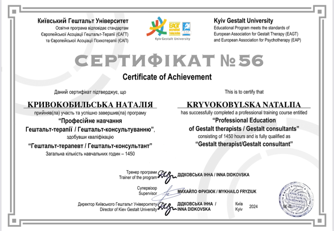 - 2015-2016г. Киевский Гештальт Университет, Первая ступень обучающей программы по подготовке психотерапевтов.