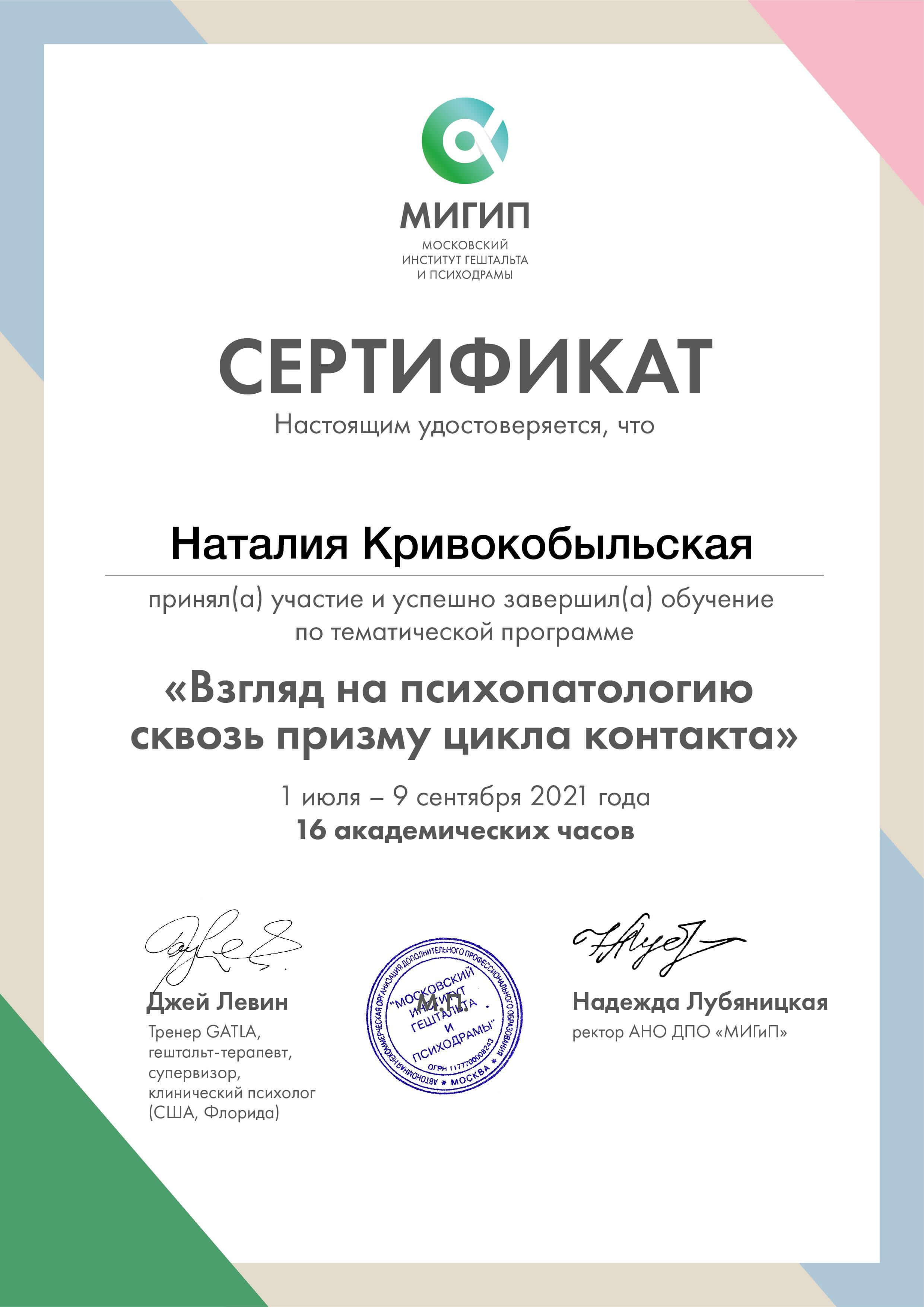 - 2017-2021 гг. Киевский Гештальт Университет, Вторая ступень обучающей программы по подготовке психотерапевтов.