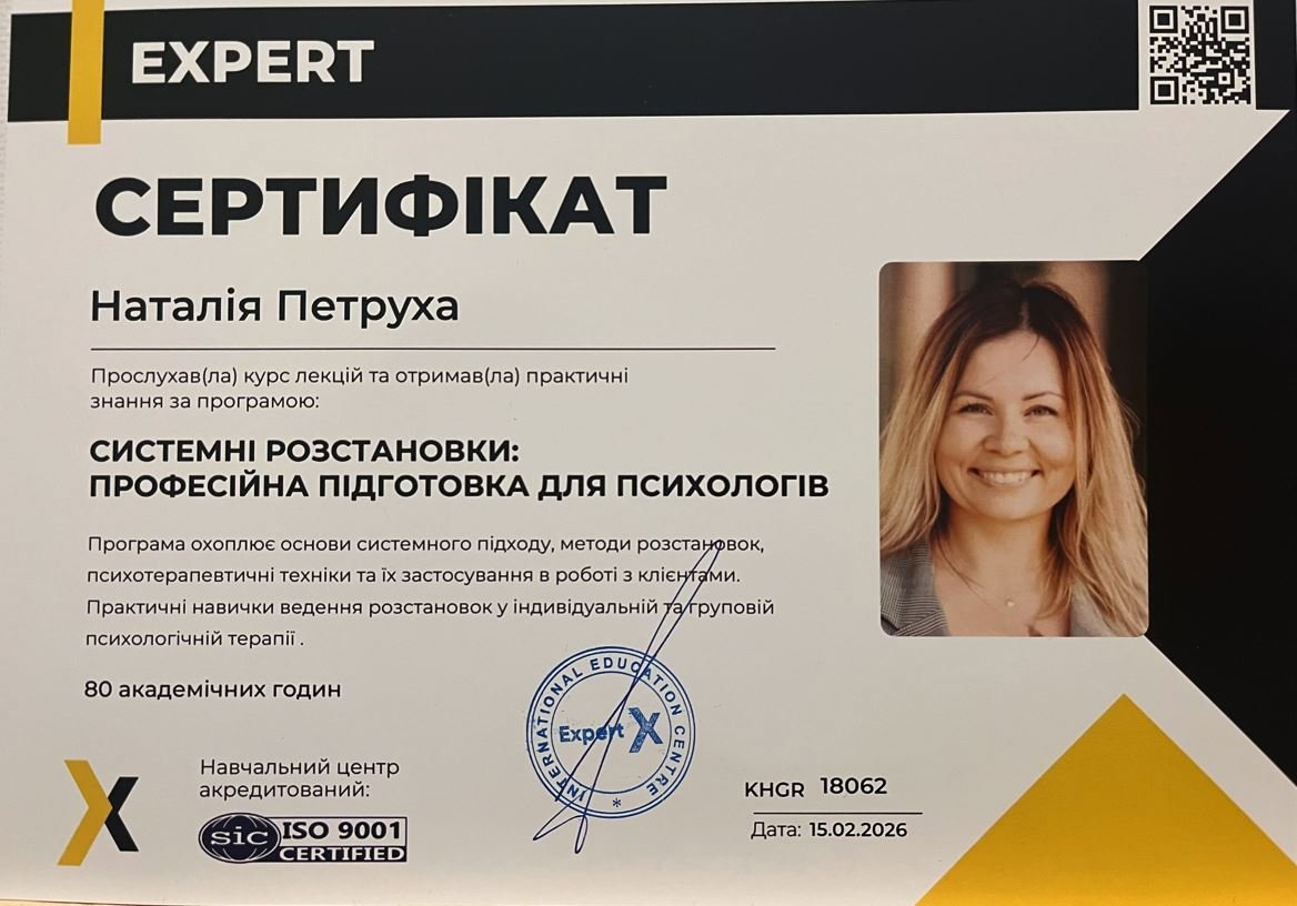 Я – практический психолог, имею более 100 учебных личных терапию с сертифицированным психотерапевтом. Постоянно участвую в учебных психологических группах. Веду психологическую практику, начиная с 2021 года, это индивидуальное консультирование, терапевтические сессии онлайн и офлайн. В работе использую разные методики работы, зависит от запроса клиента, это может быть гештальт подход, КПТ, трансактный анализ, психодрама и т.д.