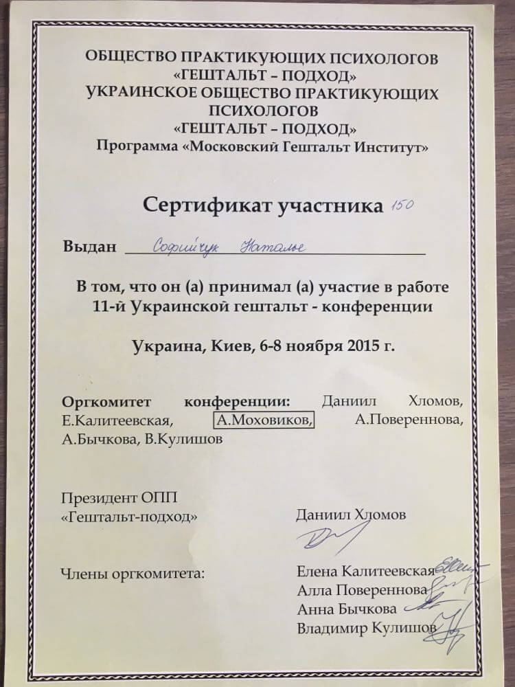 Киевский филиал Московского Гештальт Университета. Специализация по сексологии, телесной терапии и семейным системам.