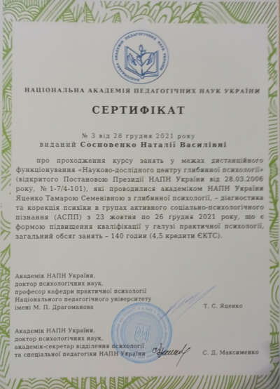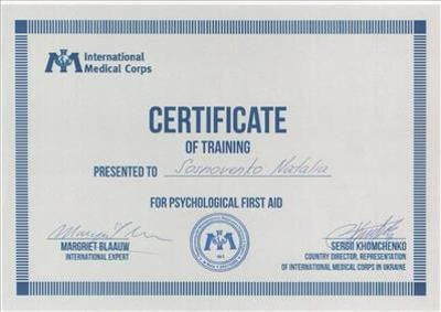Повышение квалификации: работа с горем, мирное разрешение конфликтных ситуаций, травмотерапия. На данный момент заканчиваю обучение на второй ступени гештальттерапии,