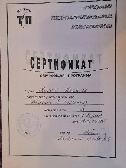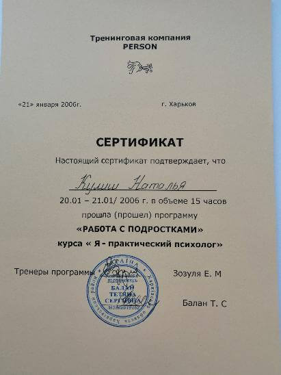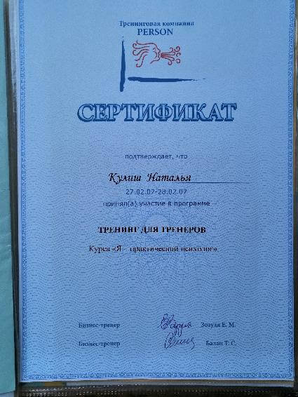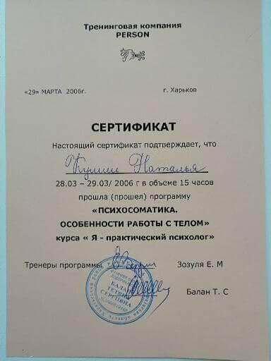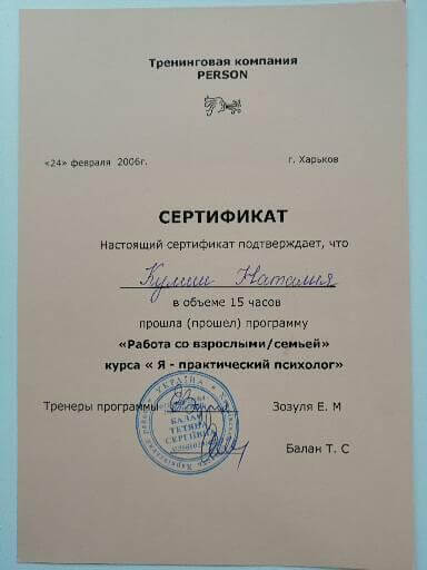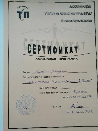 квалификация гештальт-консультант , сертификат № 3336 от 2006 г.