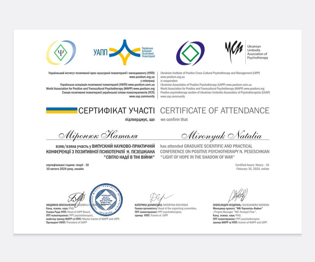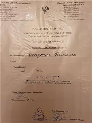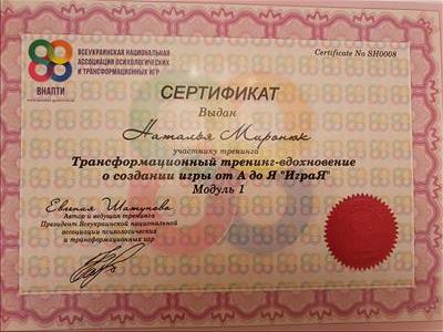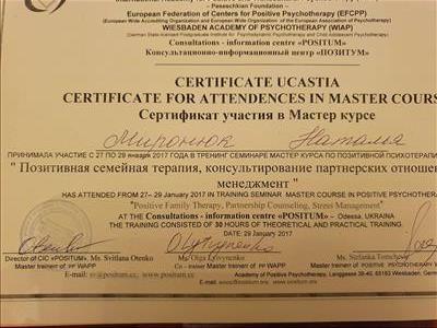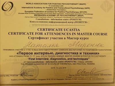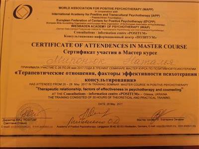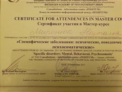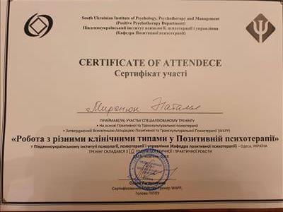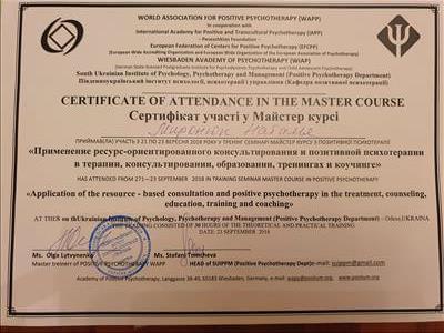 Институт Мечникова( клиническая психология). Висбаденский Институт позитивной психотерапии Пезешкиана (психотерапевт). Пропедевтика психиатрии. Член УСП.