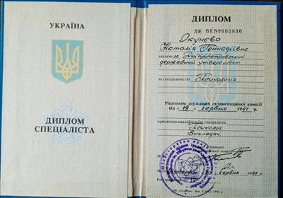 Днепропетровский государственный университет, 1997 г., специальность психология;
