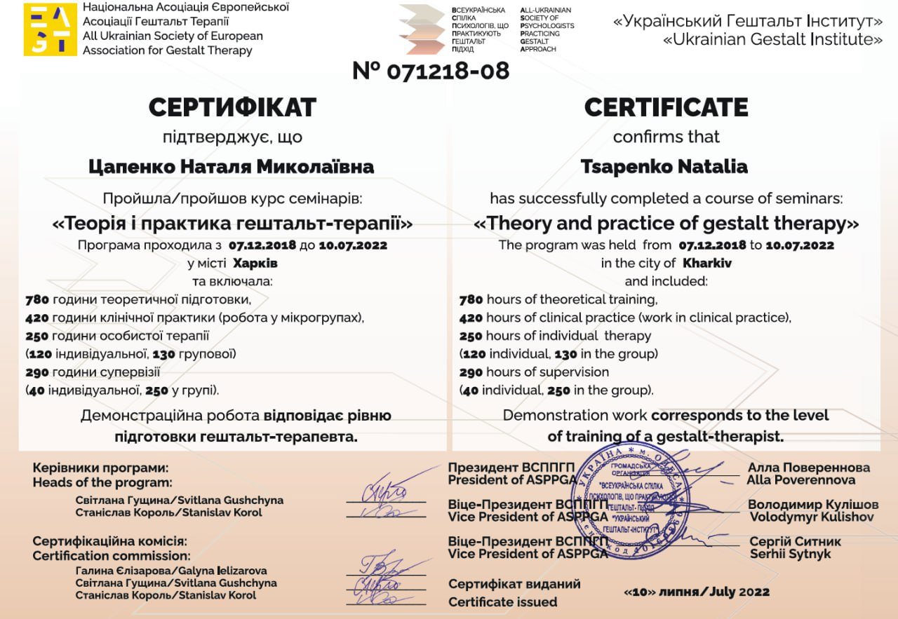 - сертифицированный гештальт терапевт