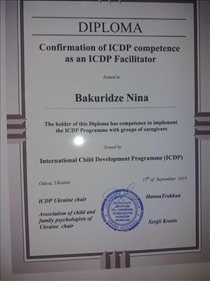 -Фасилитатор международной программы ICDP. Программа направлена на улучшение взаимоотношений взрослый- ребенок, на создание взаимодействия, способствующее уверенному развитию ребенка, создание ощущения безопасности, формированию адекватной самооцінки;