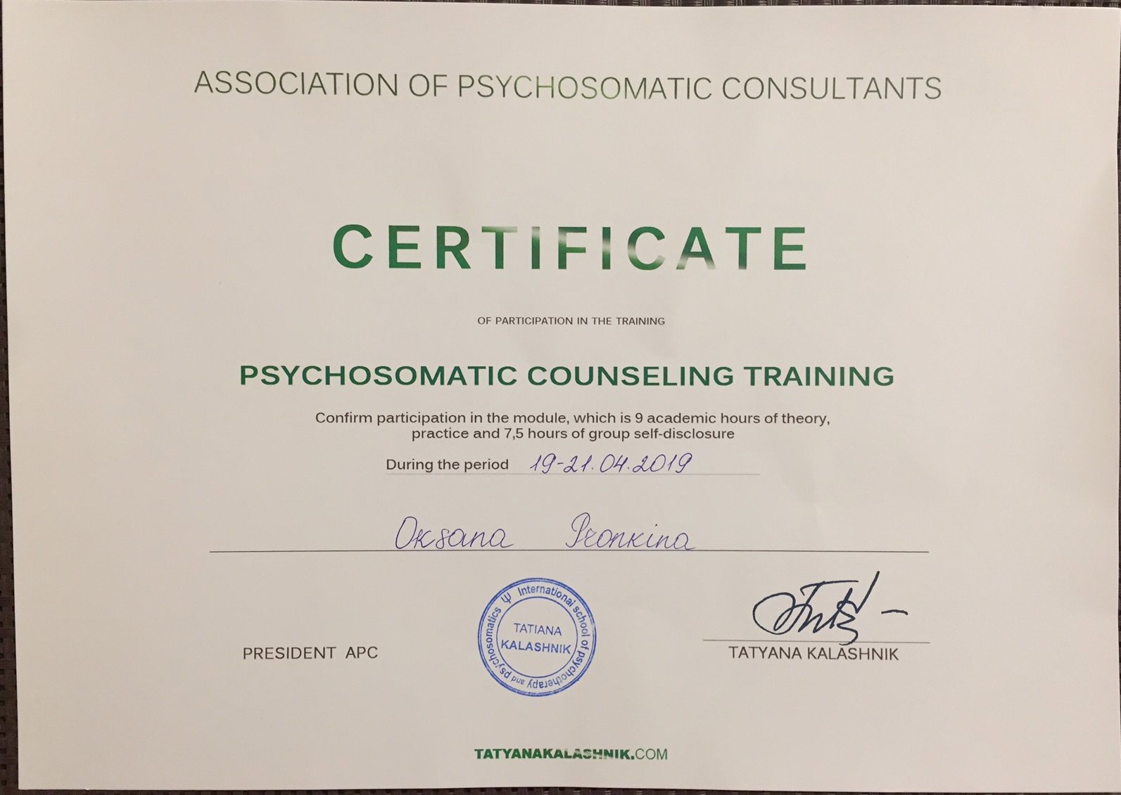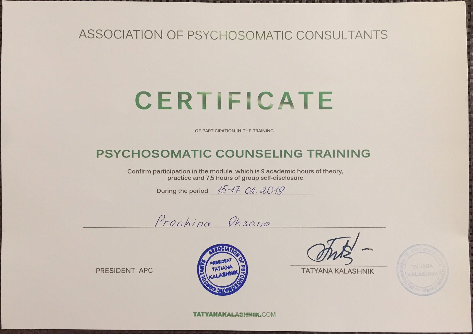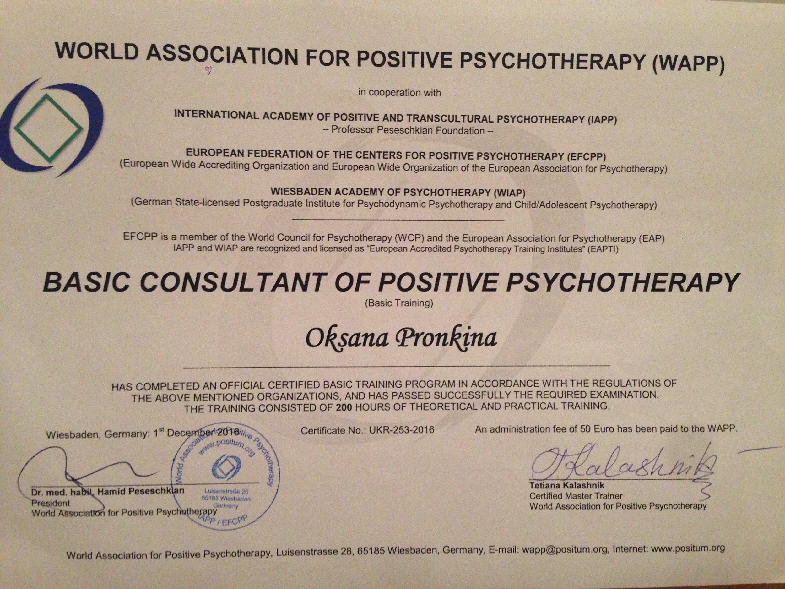 Я сертифицированный консультант по методу Позитивной Психотерапии (официально признанным Европейской Ассоциацией Психотерапии), дипломированный психолог, эксперт Психосоматической Медицины и Аутентичного Коучинга.