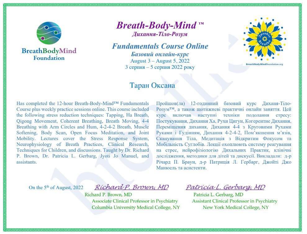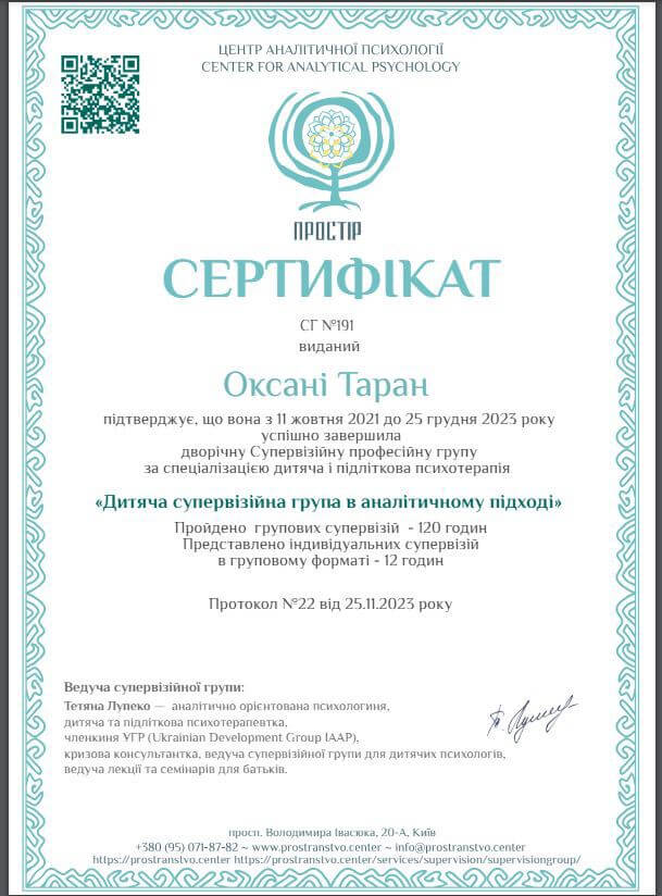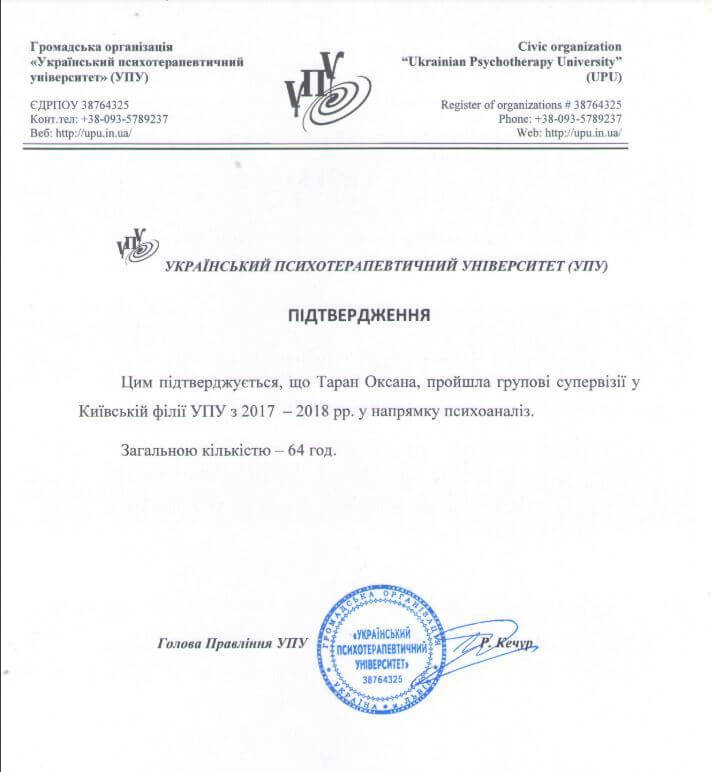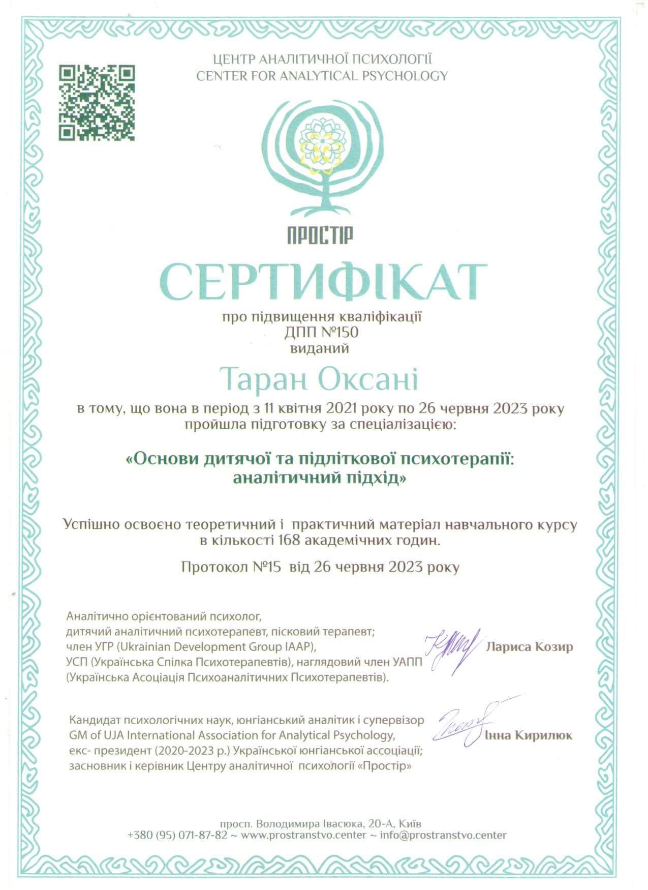 «Аналитико-ориентированный сопровождение детей и взрослых» (500 часов) Ассоциация психологов и психотерапевтов Николаевской области. 2008 - 2013 годы.