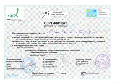 Первая и вторая ступень образовательной программы Московского Института Гештальта и психодрамы по гештальт консультированию / терапии (400 часов) в мастерской Вячеслава Гусева. 2000 - 2003 года.