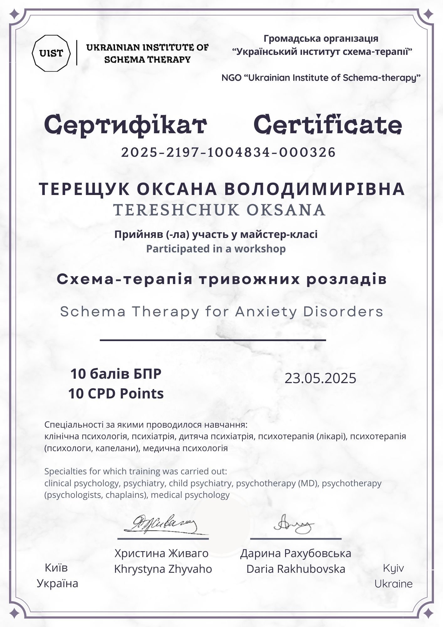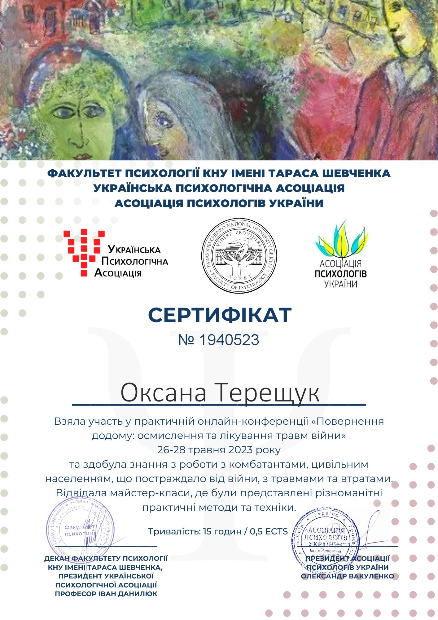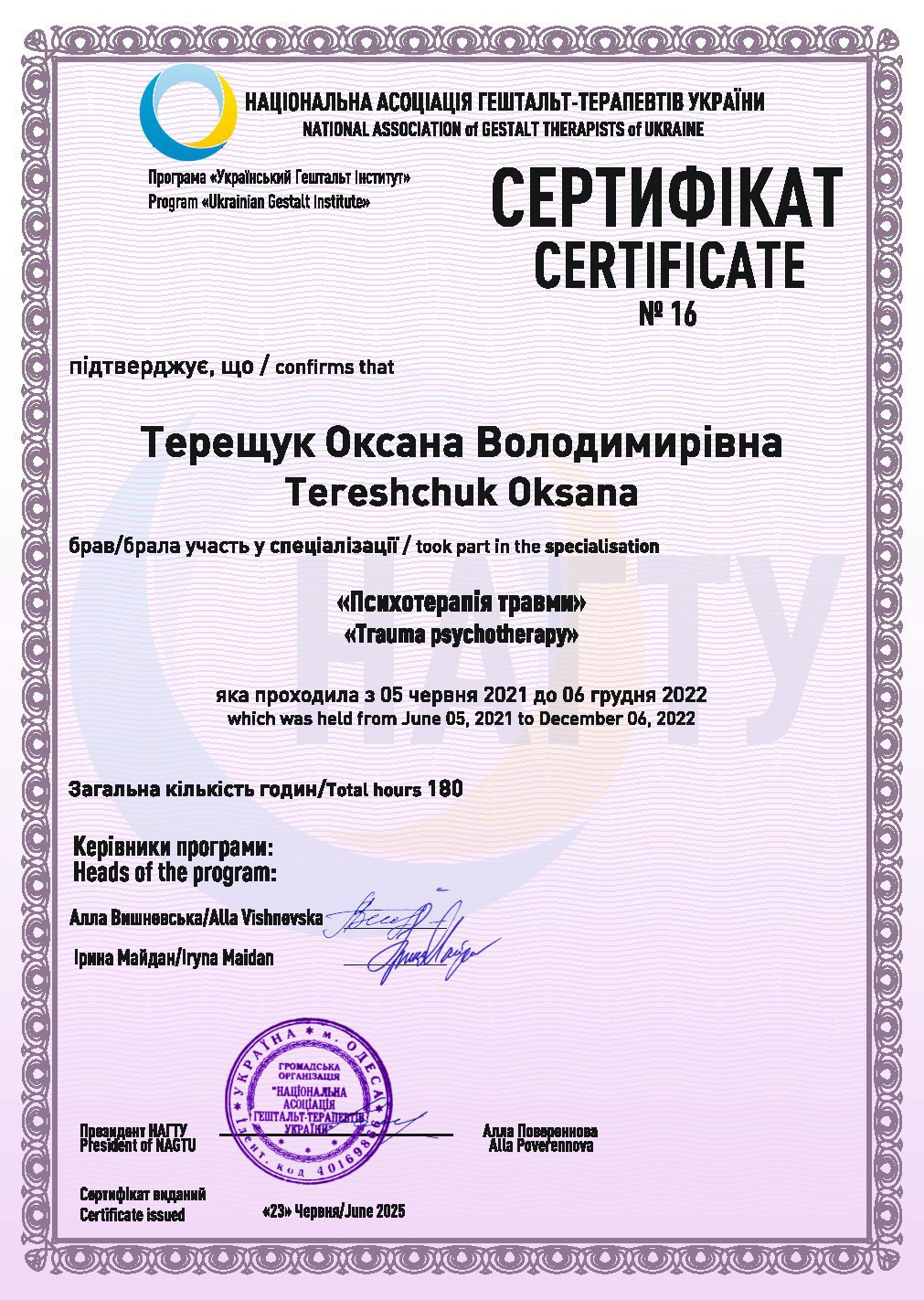 УГИ, член ВОППГП с 2017 года,"Основы гештальт -терапии",1 -я и 2-я ступени.