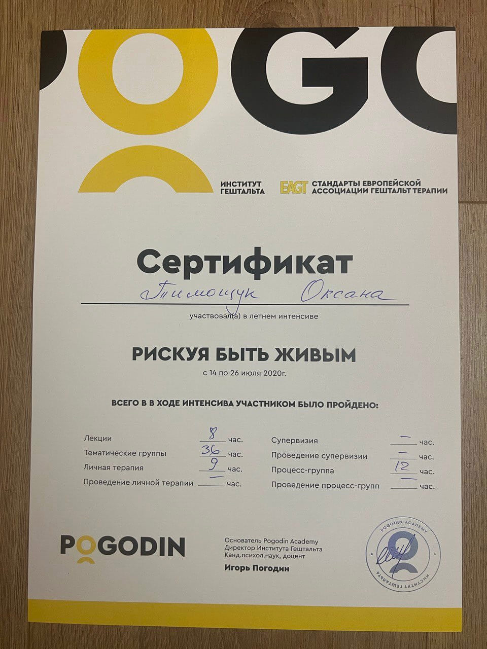 Pogodin Academy «Теория и практика гештальта терапии» 1 ступень.