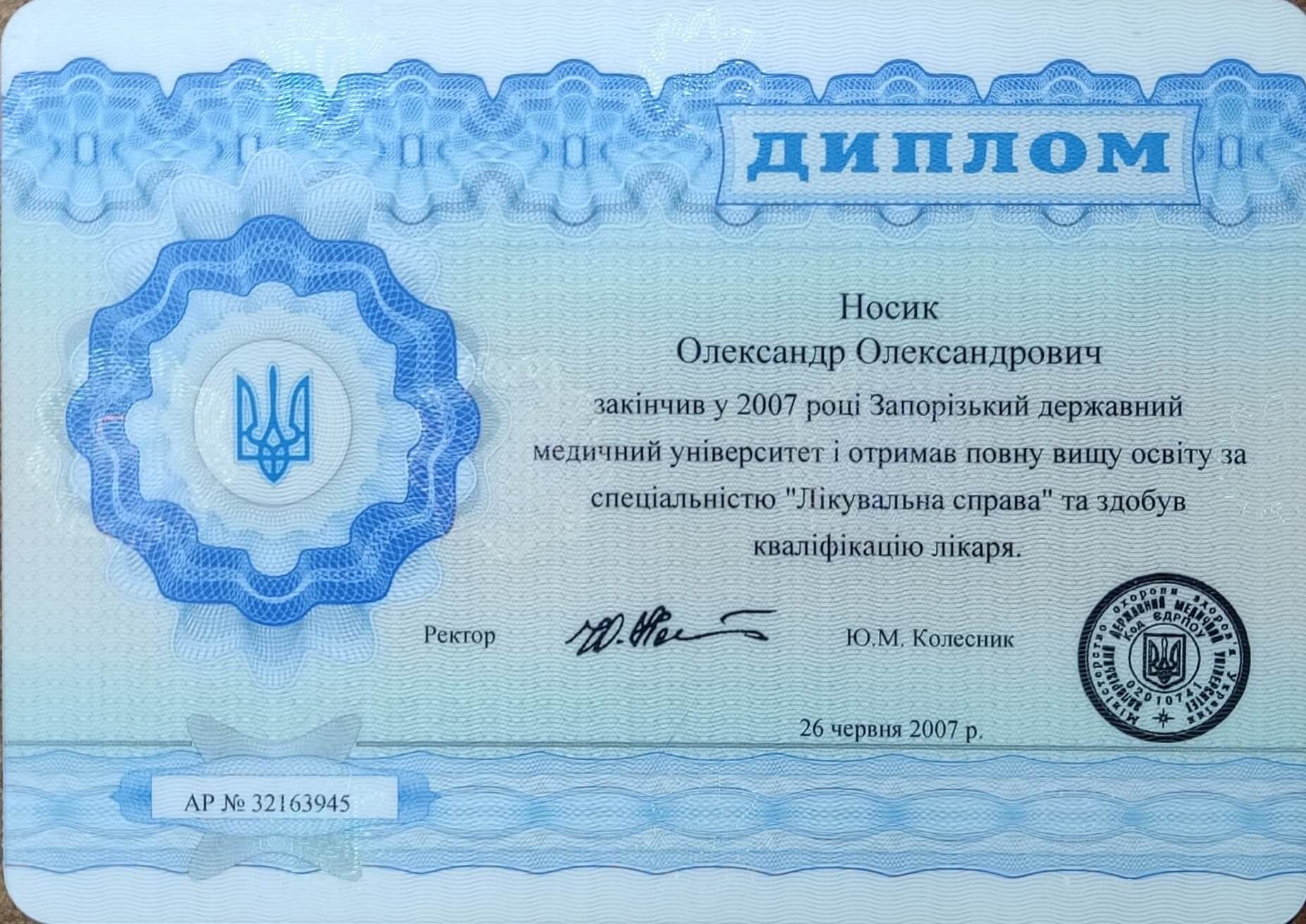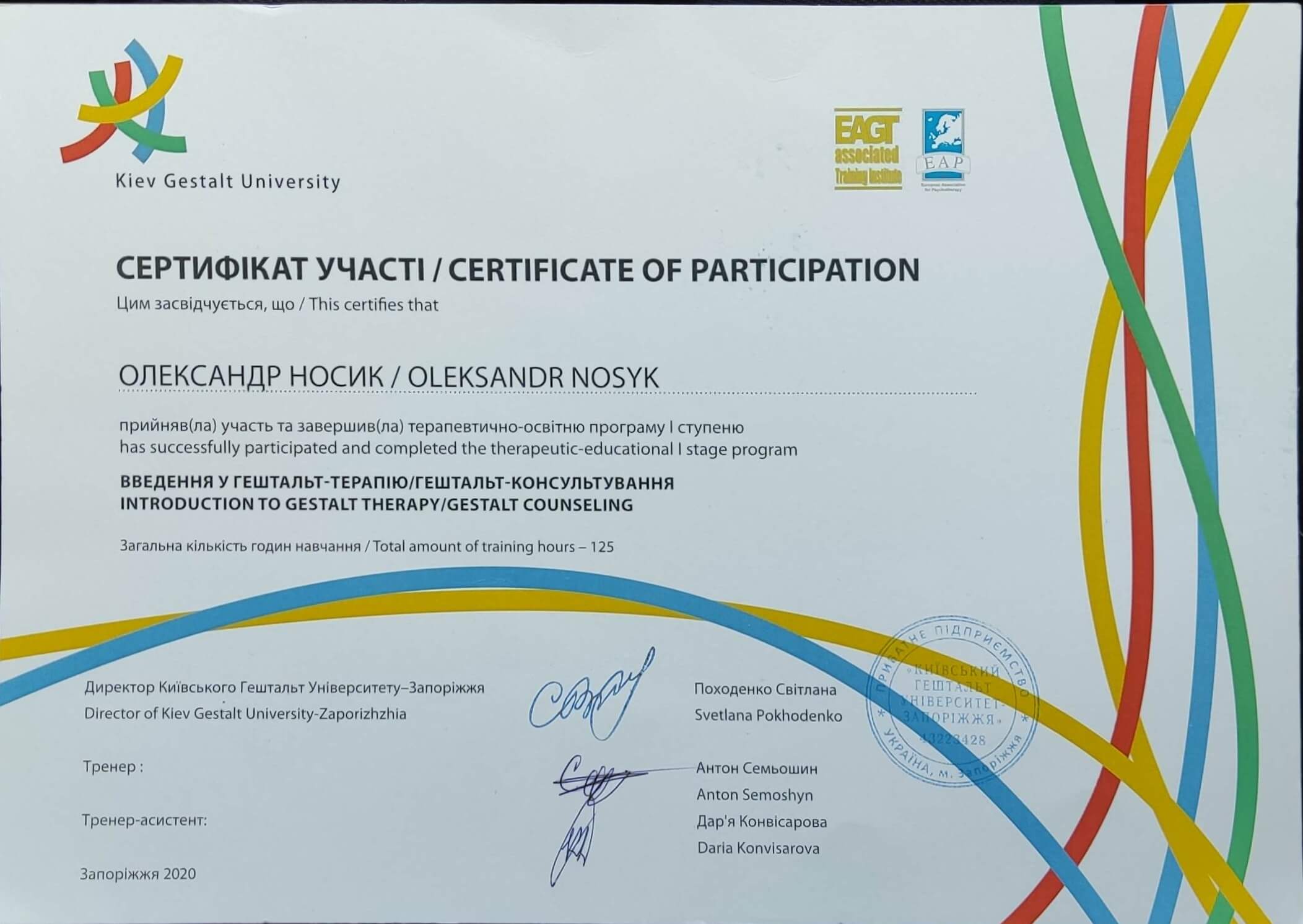 Запорожский Государственный Медицинский Университет 2007 года, врачебное дело. 2019-2020гг |-ступенька Киевского Гештальт Университета, 2021г. и до сих пор ||-ступеньца .